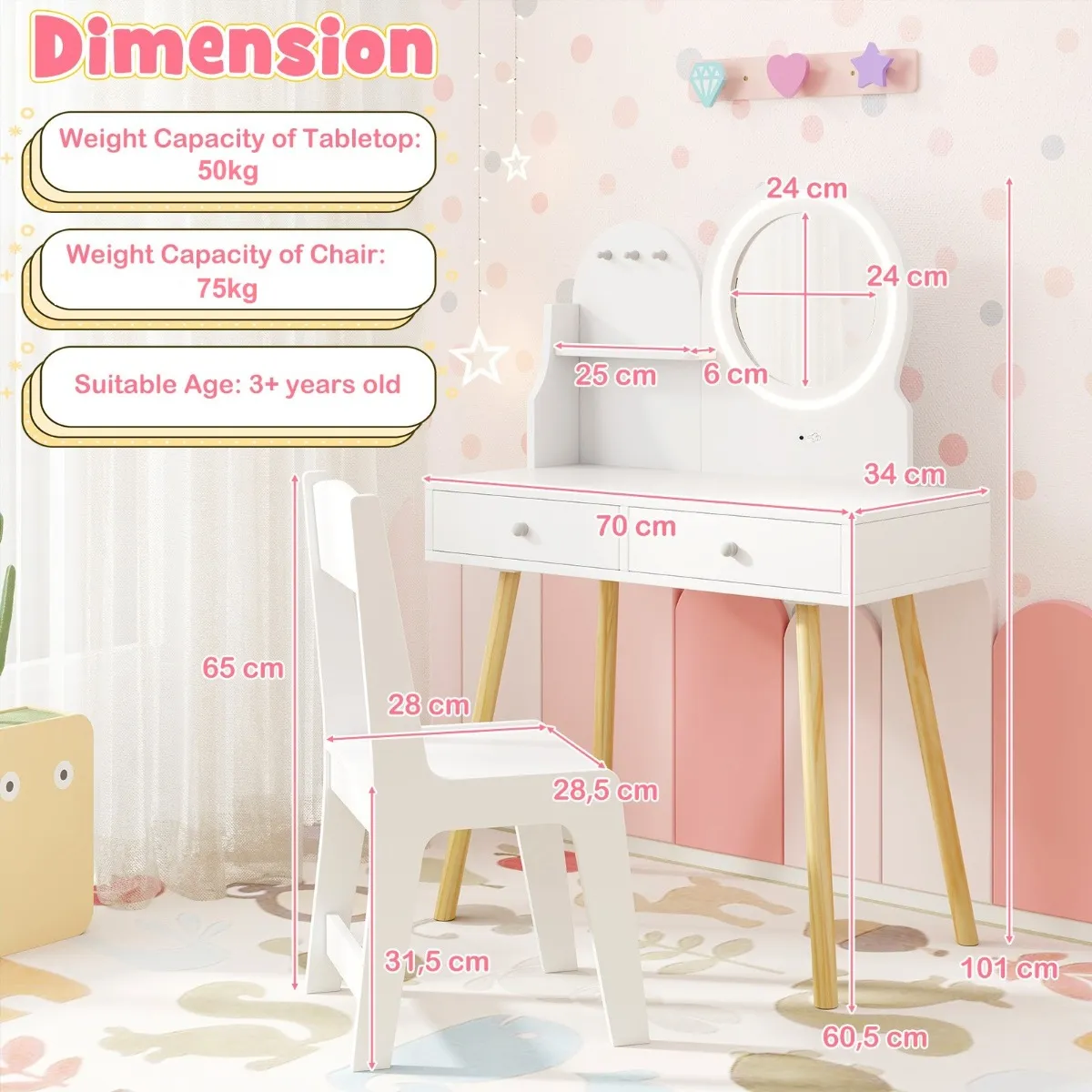 【Perfect cadeau voor kinderen】: Ideaal voor verjaardagen, feestdagen, Kerstmis of andere speciale gelegenheden. Deze multifunctionele kaptafelset is het ultieme cadeau voor uw kinderen, perfect om op te kleden, lezen, schrijven, tekenen, enz. Afmetingen tafel: 70 x 34 x 101 cm (L x B x H). Afmetingen stoel: 35 x 31 x 65 cm (L x B x H).