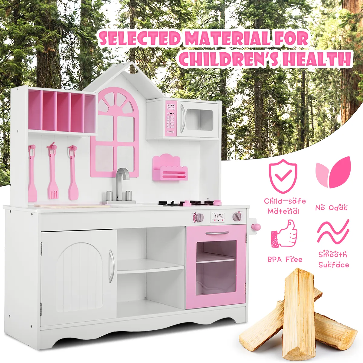Deze houten speelkeukenset is gemaakt van hoogwaardig hout dat veilig, stabiel en duurzaam is. Het laat kinderen echt koken ontdekken en bevredigt hun nieuwsgierigheid. Bovendien bevat deze kinderkeukenset veel accessoires waarmee meerdere kinderen kunnen spelen en waarmee ze hun handvaardigheid en samenwerkingsvaardigheden kunnen ontwikkelen.