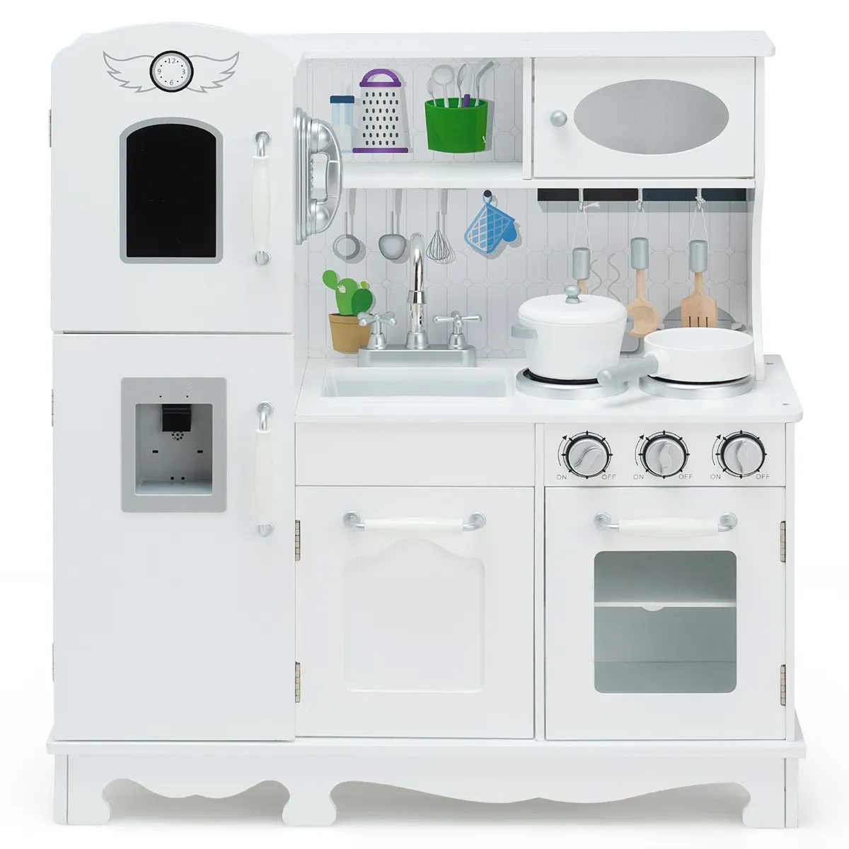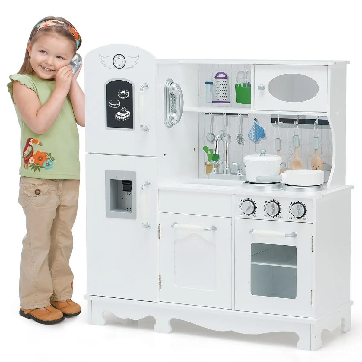 Het is ontworpen met een realistisch uiterlijk, inclusief gootsteen, gesimuleerde oven, praktische kast, waterdispenser, schoolbord, koelkast, vintage telefoon met handsfree clip en ander speelgoed voor keukenaccessoires. Waar wacht je op? Koop het en geniet van het plezier van koken met uw kinderen.