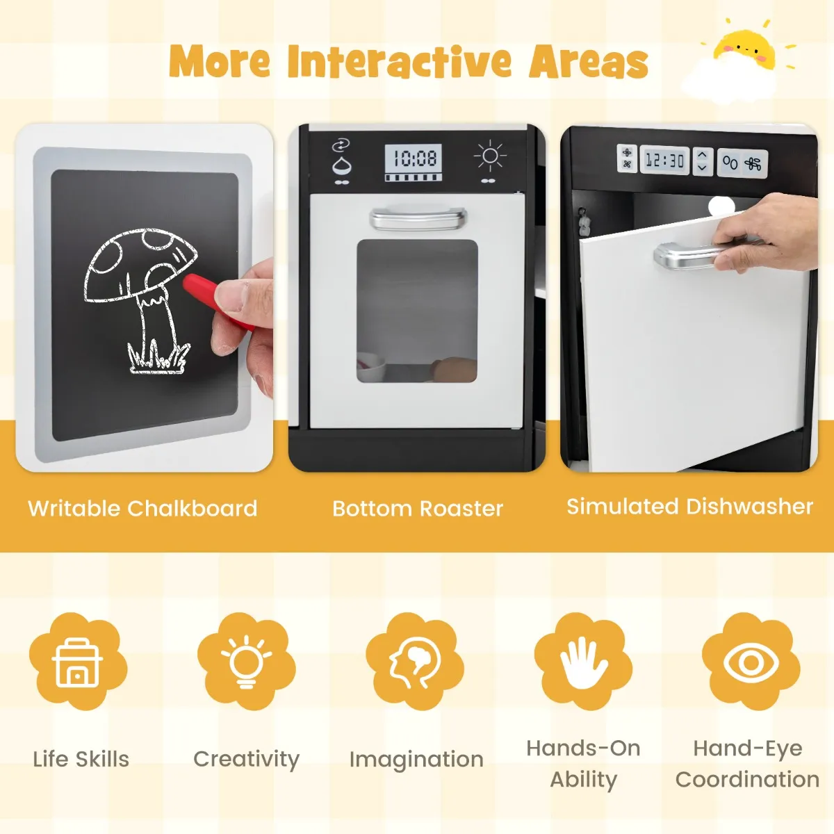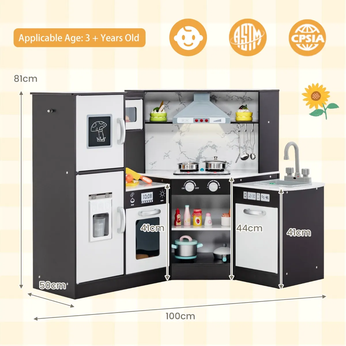 Onze kinderhoekkeukenspeelset beschikt over realistische licht- en geluidseffecten op de magnetron, de afzuigkap, de aparte wastafel en de kookplaten. En deze speelkeuken beschikt over andere interactieve gebieden zoals een ijsmaker, een bord en draaibare knoppen. Kinderen kunnen aangeven om te wassen, te bakken, te verlichten of te koken.