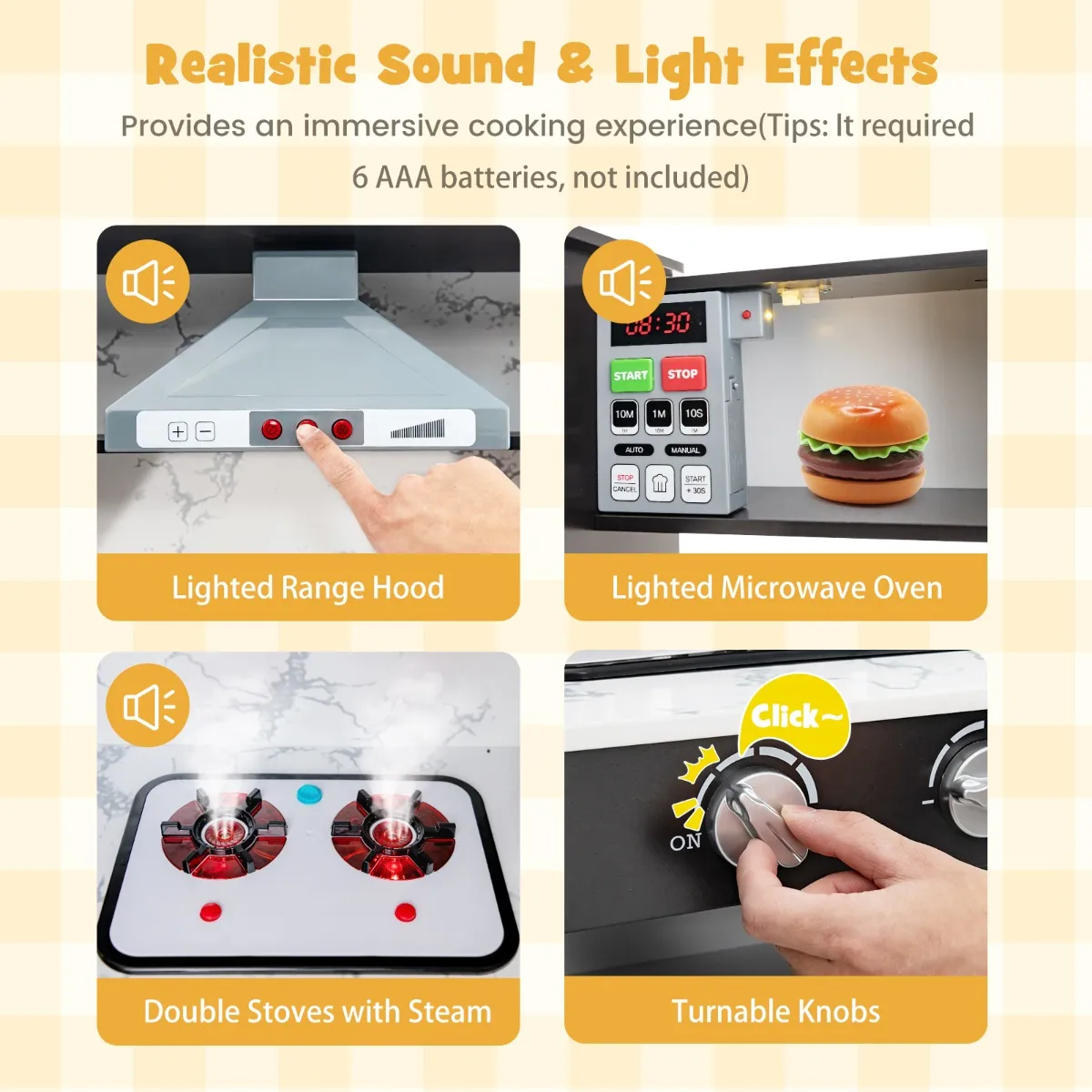 【Verschillende geluiden en lichten】 Er zijn realistische geluids- en lichteffecten op de magnetron, afzuigkap en dubbele stoomkokers. De draaiknoppen maken geluid als kinderen eraan draaien.