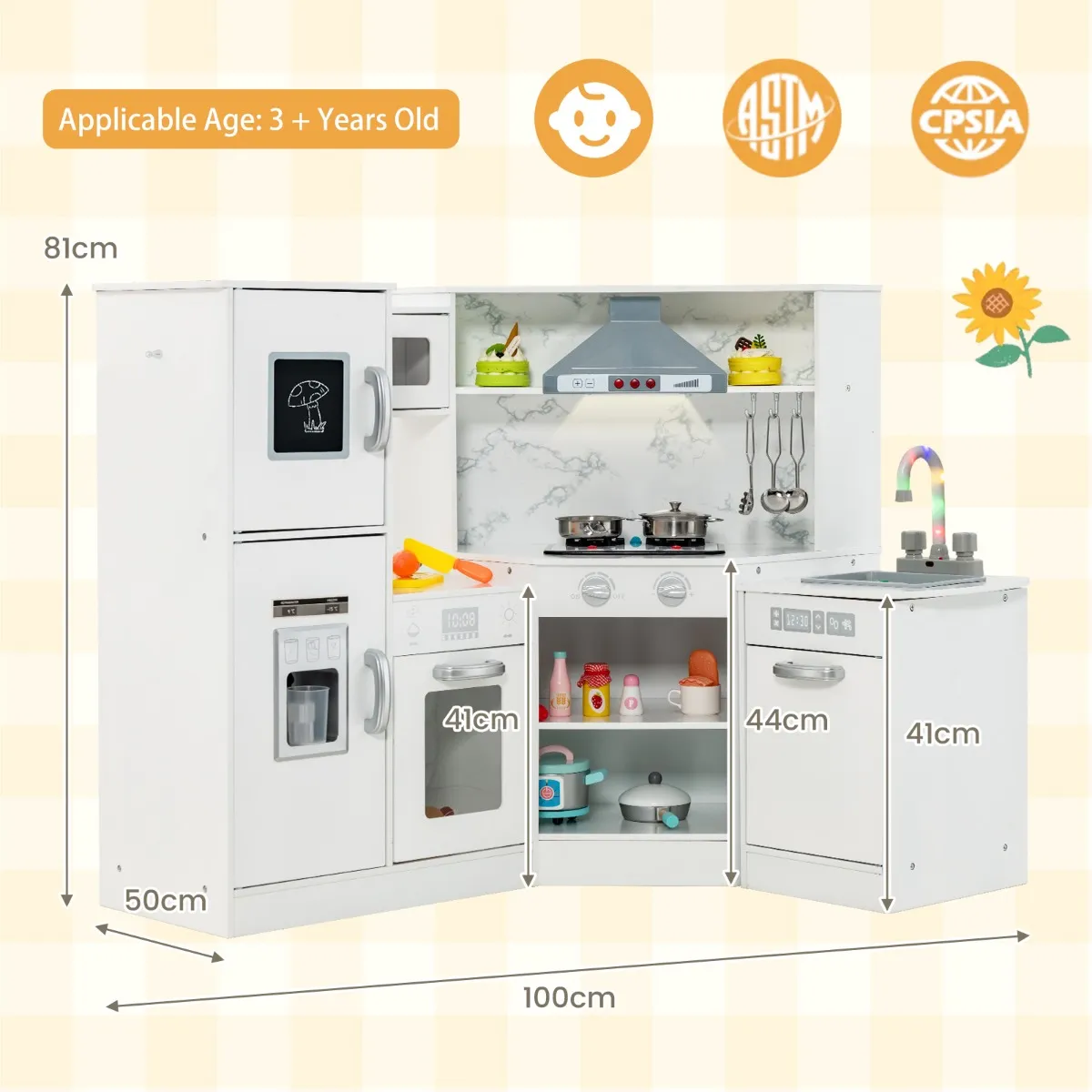 【Veel opbergruimte】 3 keukenhaken houden het keukengerei netjes opgeborgen. Open planken bieden voldoende opbergruimte voor verschillende speeltjes.
