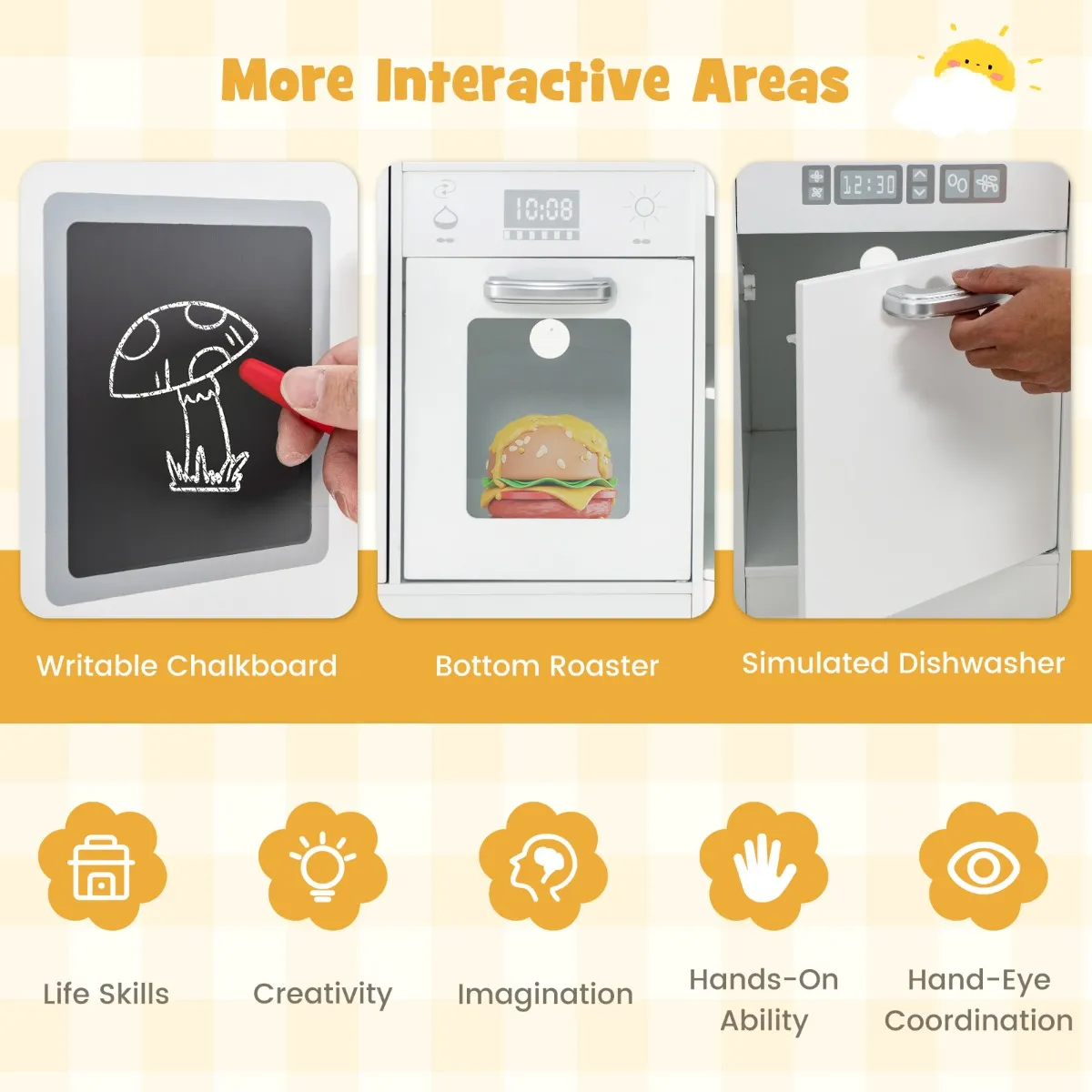 Onze kinderhoekkeukenspeelset beschikt over realistische licht- en geluidseffecten op de magnetron, de afzuigkap, de aparte wastafel en de kookplaten. En deze speelkeuken beschikt over andere interactieve gebieden zoals een ijsmaker, een bord en draaibare knoppen. Kinderen kunnen aangeven om te wassen, te bakken, te verlichten of te koken.