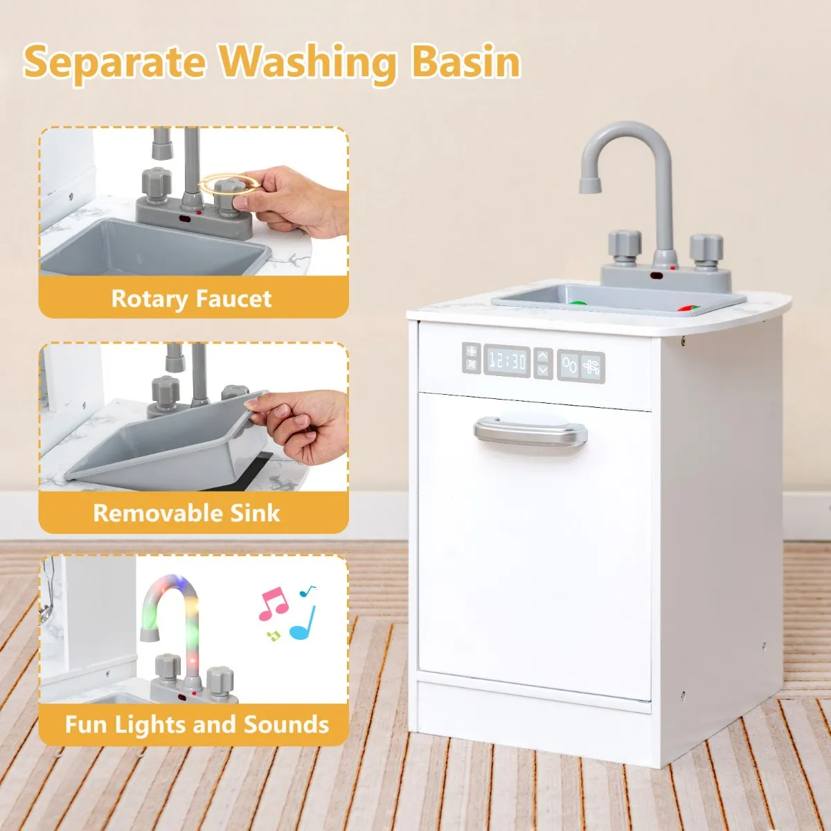 【Aparte spoelbak】 Onze kinderhoekkeuken is voorzien van een aparte spoelbak. Dankzij de roterende kraan en de afneembare spoelbak kan uw kleintje doen alsof hij groenten wast.