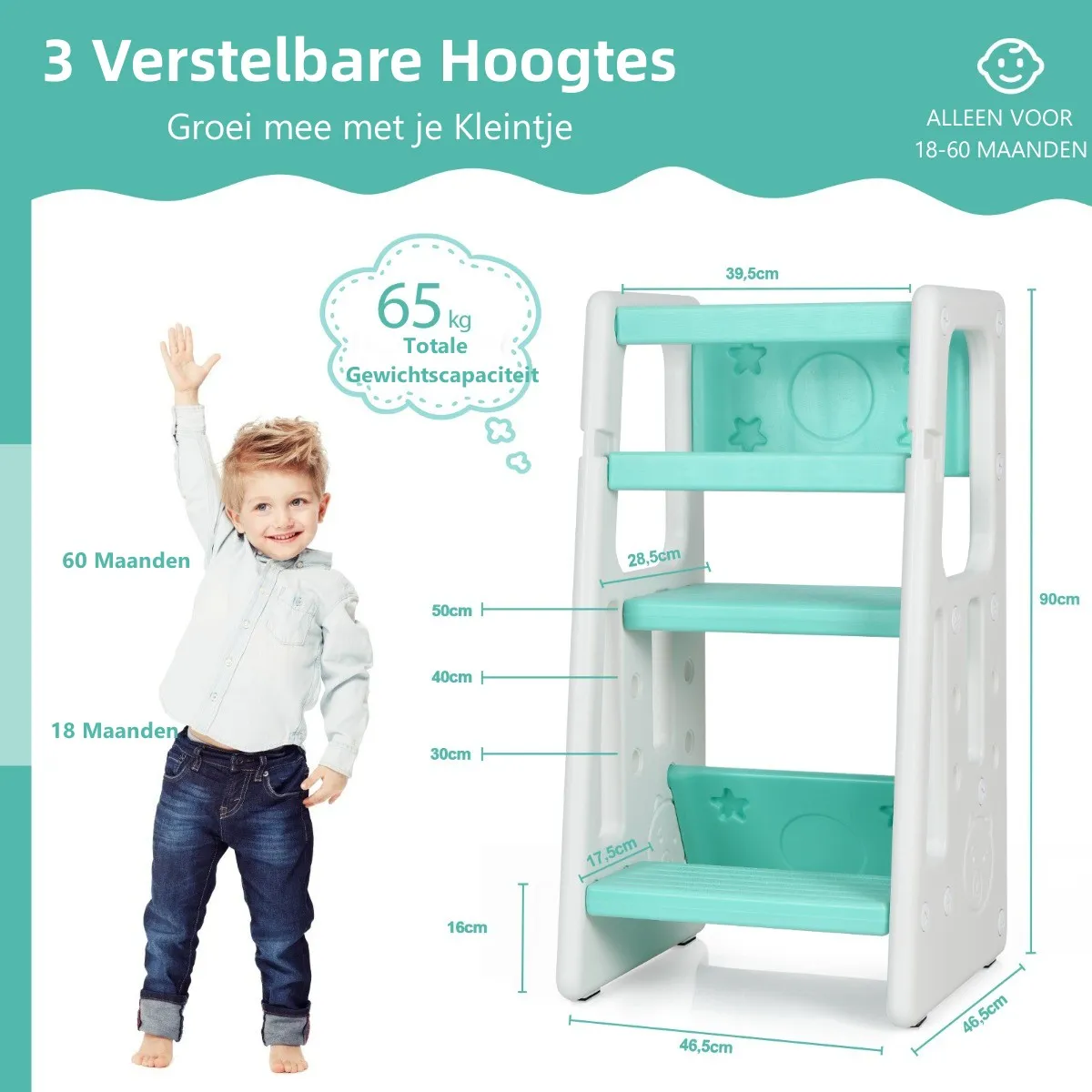 3 Instelbare hoogtes: Deze veilige peutertoren heeft 2 antislip treden, de grote kan in 3 verschillende hoogtes worden versteld. De toren is geschikt voor peuters van 18 tot 60 maanden en kan tot 90 kg dragen.