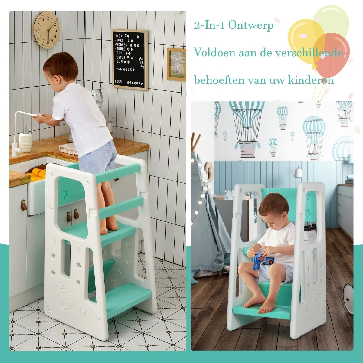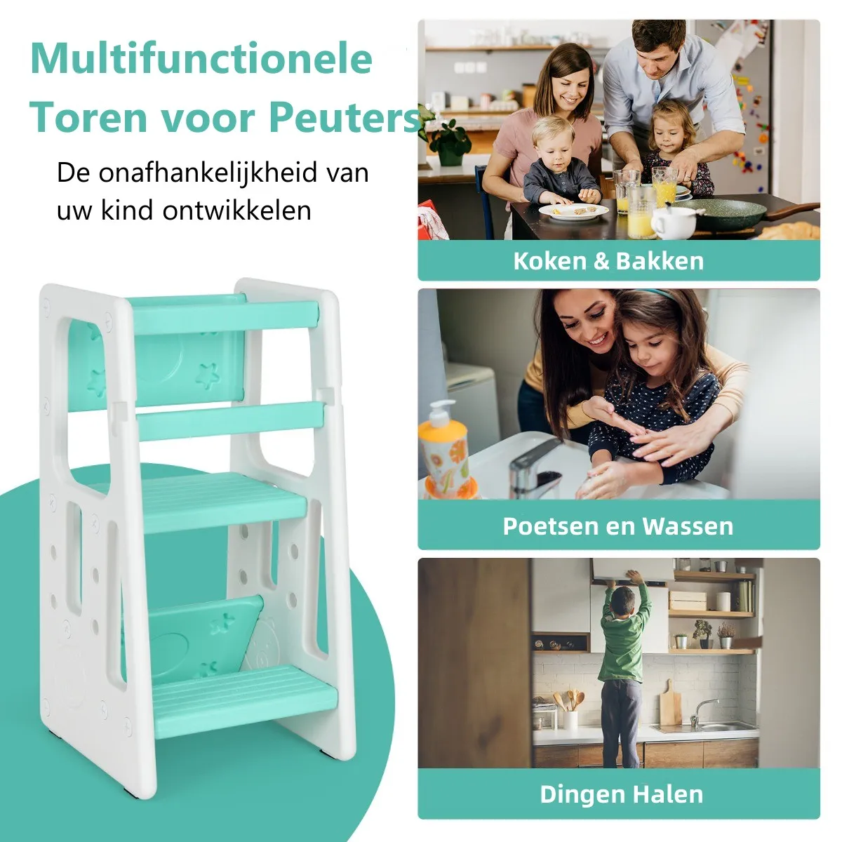 Multifunctioneel ontwerp: Wanneer uw kinderen groter worden, kunt u de dubbele veiligheidsrails verwijderen. Zo dient hij niet alleen als kindertoren, maar kan hij ook als kinderstoel worden gebruikt, zodat hij met uw peuters meegroeit en in hoge mate aan hun verschillende behoeften voldoet.