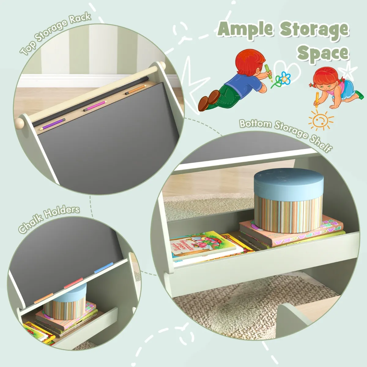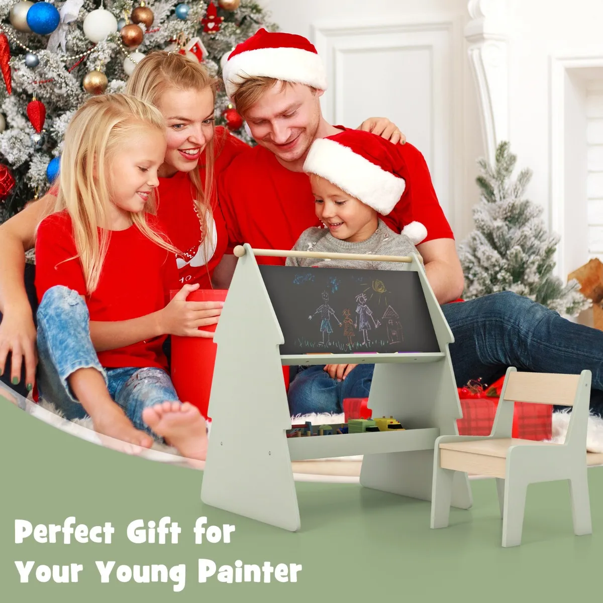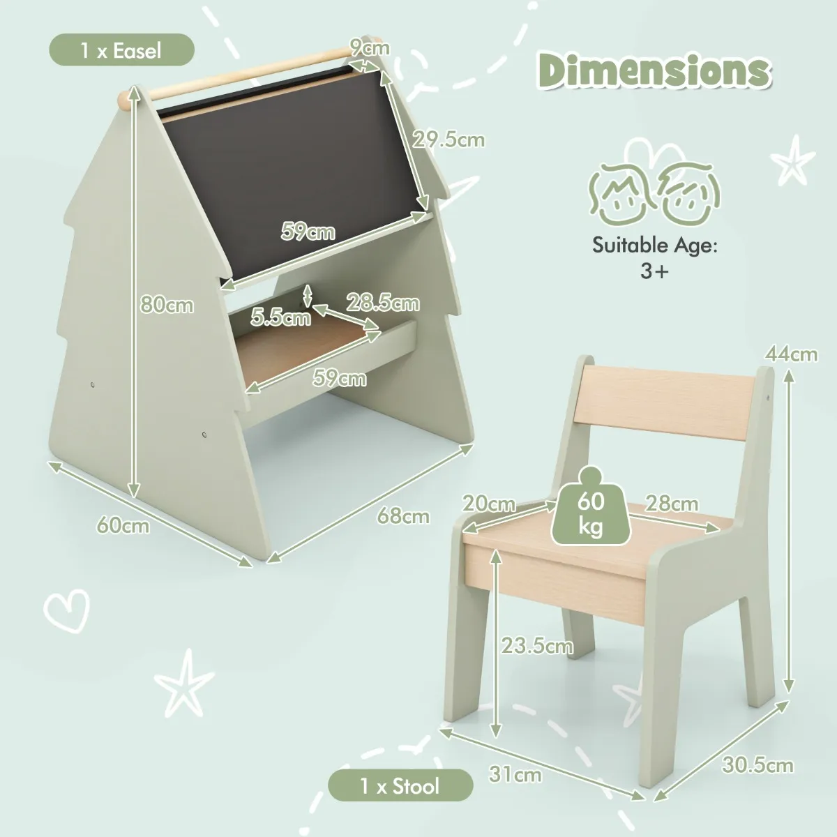 Onze 2-in-1 kunst-ezel met krukje heeft aan elke kant een krijtbord en een handige houder voor rollen schilderpapier. Het is ontworpen voor zowel plezier als veiligheid en heeft een stevige driehoekige structuur, afgeronde hoeken en een splintervrij oppervlak, wat zorgt voor een veilige ruimte. Het wordt geleverd met opbergruimte, zodat kinderen hun knutselspullen netjes en georganiseerd kunnen opbergen. Deze set stimuleert niet alleen de creativiteit, maar vergroot ook het zelfvertrouwen en verbetert de fijne motoriek. Het is een perfect cadeau voor elke gelegenheid!