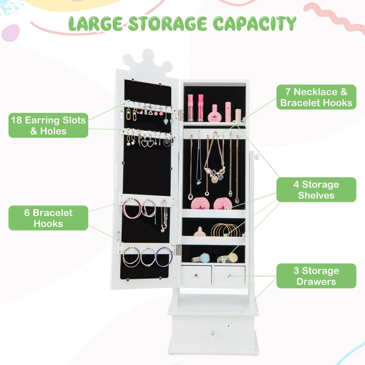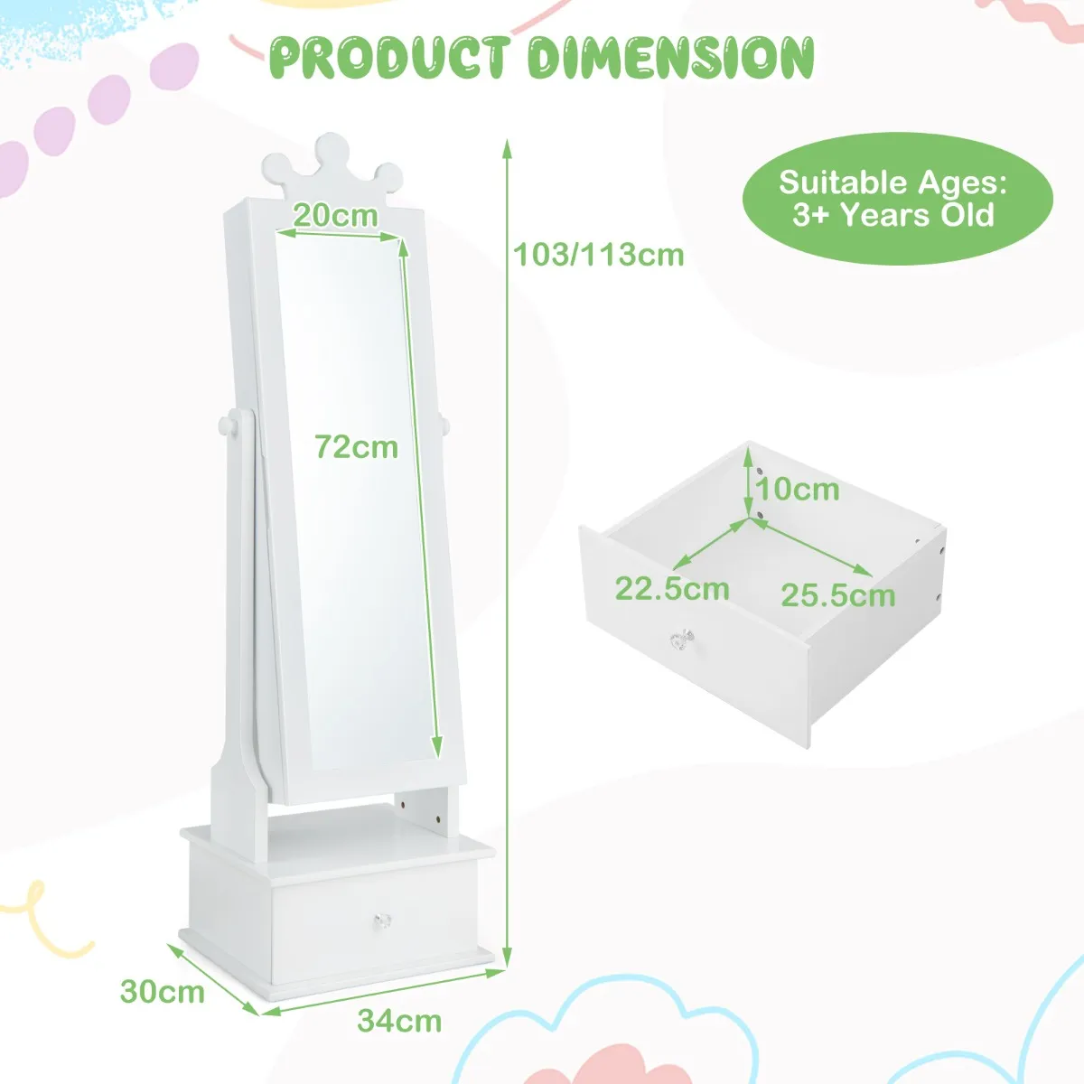 Dit schattige sieradenkastje met spiegel is ideaal voor peuters vanaf 3 jaar om zich te verkleden. De meeste kinderen vinden de bovenste kroon leuk. De passpiegel met 2 verstelbare hoeken biedt een zicht van top tot teen, zodat kinderen in één oogopslag hun outfit kunnen zien. Het heeft nu 18 sleuven en gaten voor oorbellen, 7 kettinghaken, 6 armbandhaken, 4 opbergvakken en 2 kleine lades achter de spiegeldeur. In de onderste lade kunnen kinderen ook hun sokken of sjaals opbergen. Om de stabiliteit en veiligheid te garanderen, hebben we hem uitgerust met een anti-kantelsysteem en antislipvoetkussens.