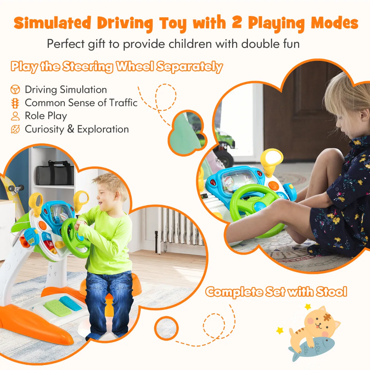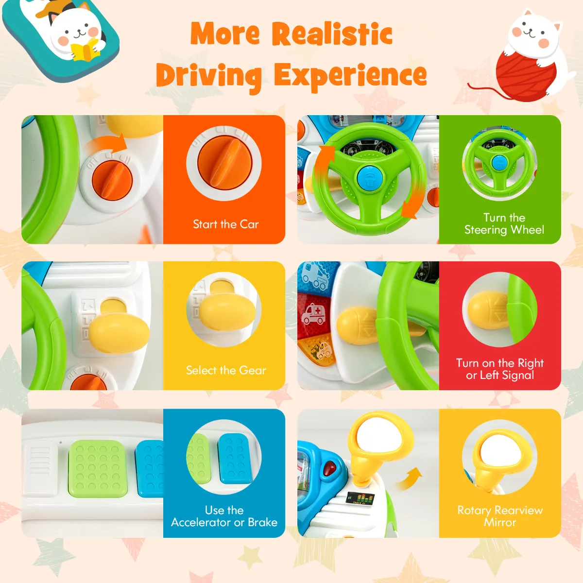 Gesimuleerd drijfstuk speelgoed: Kinderen kunnen de auto op het scherm besturen door het stuurwiel te draaien. Het onderste pedaal heeft infrarode stralen die op afstand het gaspedaal en de rem bedienen, waardoor uw kinderen urenlang plezier hebben. Bovendien kunnen ze met de megafoon doen alsof ze een echte bestuurder zijn door op de knop te drukken en te praten.