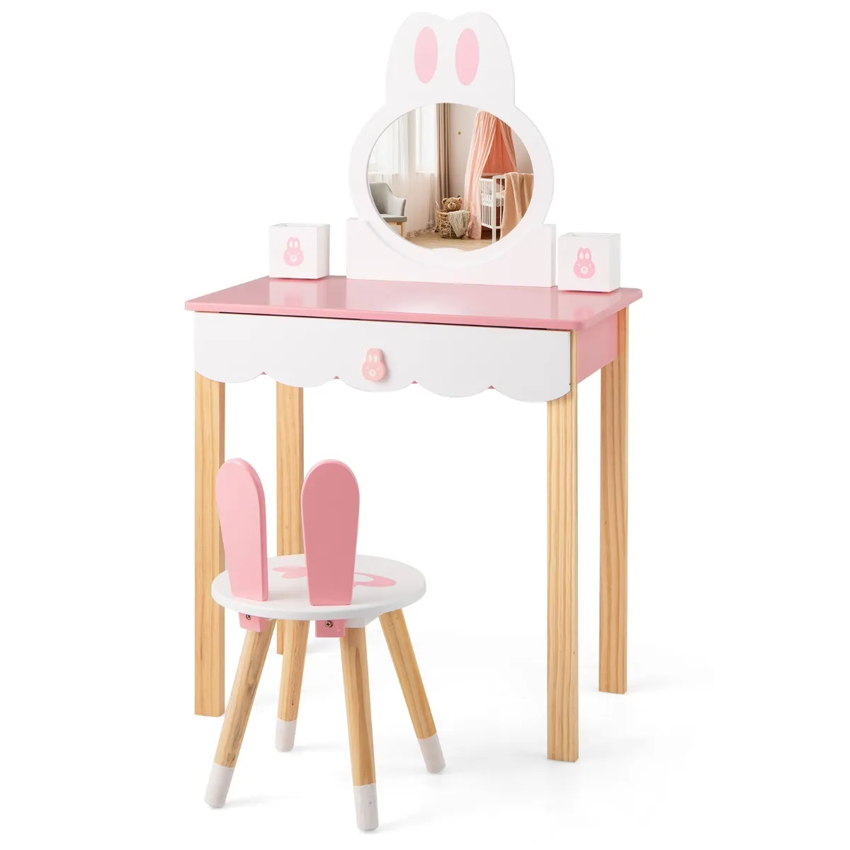 Deze kaptafel set met spiegel is een prachtige aanvulling op de kamer van uw kleine kind en kan een perfect cadeau zijn. De bunny oor stijl is erg schattig en zal onmiddellijk de aandacht trekken van uw kinderen. De vervaardigde houten constructie is zeer duurzaam en robuust. De vier poten met anti-slip pootdoppen zorgen voor de veiligheid van uw kinderen. Bovendien is het grote bureaublad een geweldige plek om dagelijkse benodigdheden op te leggen, terwijl de grote lade extra opbergruimte biedt om alle haaraccessoires, stickers en sieraden op orde te houden en een opgeruimde omgeving te creëren. Bovendien is de meegeleverde stoel, ontworpen met een konijnen oren gevormde rugleuning, aangepast aan kinderen. Als u op zoek bent naar een dergelijk product, aarzel dan niet en koop het nu.
