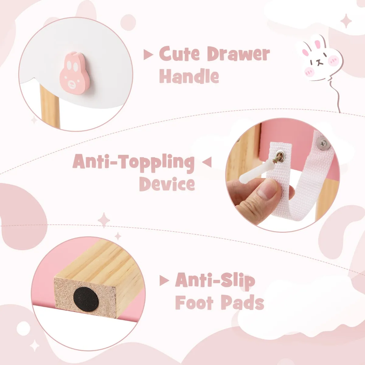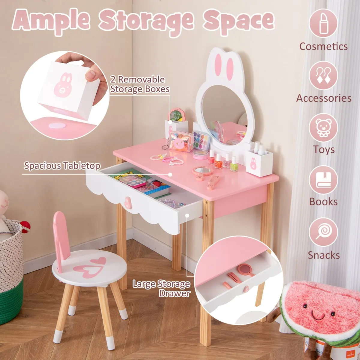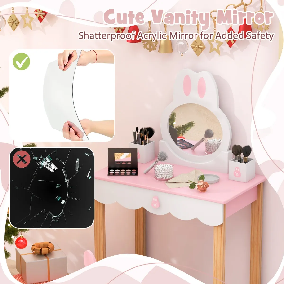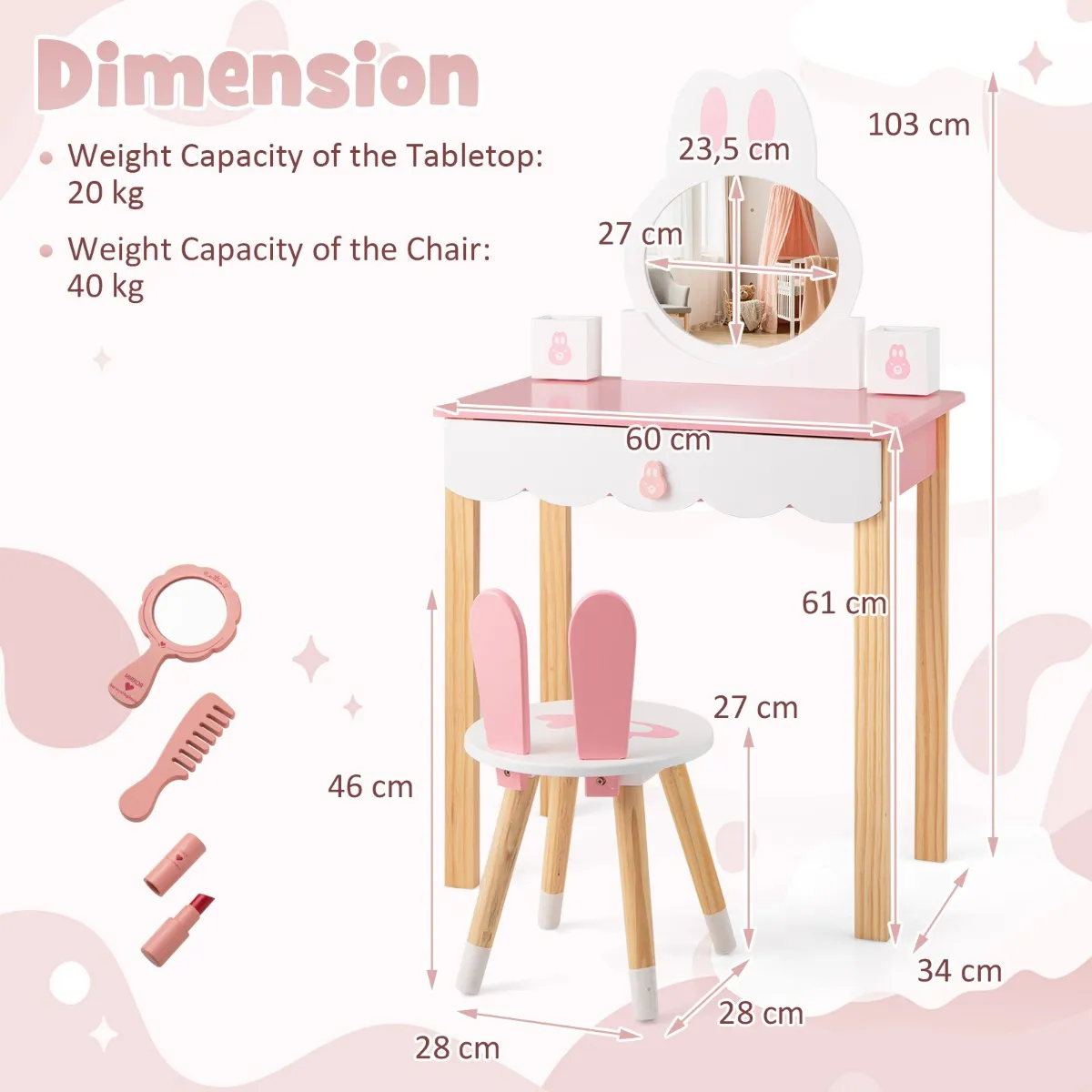 【Konijn stijl & echte spiegel】Zowel de spiegel als de rugleuning van de stoel hebben de vorm van konijnenoren, wat de kamer van uw kleine kind nog mooier maakt. De grote spiegel kan het gezicht van het kind duidelijk weerspiegelen, zodat ze hun make-up en kapsel gemakkelijk kunnen bekijken.