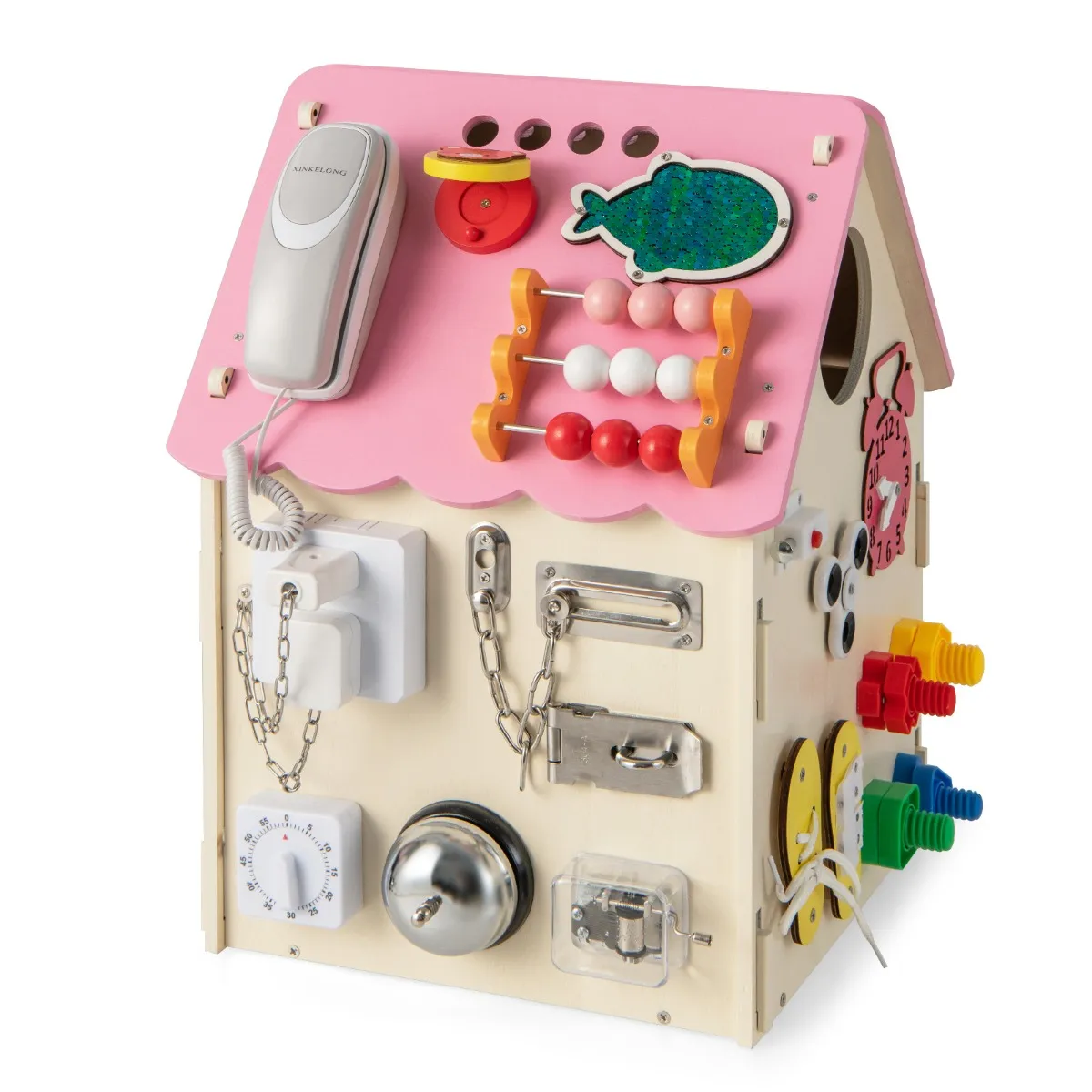 Educatief speelgoed: Dit educatieve speelgoed is uitgerust met vele speelgebieden zoals klittenbandsluiting, schakelaar, rol, klok en grendel, waarin kinderen meer levensvaardigheden kunnen leren.