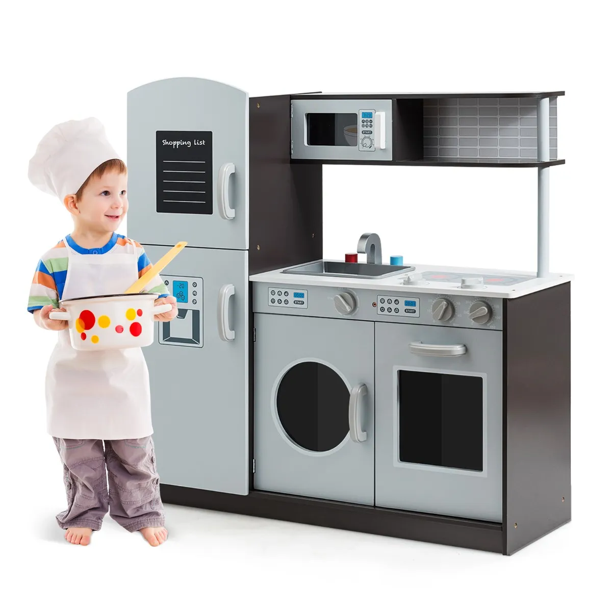 Laat uw kleintjes genieten van hun gelukkige jeugd met deze houten speelkeuken! Met rijke gebieden die de echte keuken nabootsen, biedt deze speelset een realistische kookreis voor kinderen. Het fornuis met draaiknoppen, de gootsteen met kranen, de koelkast met een schoolbord, de oven, enz. zullen uw kinderen voortdurend plezier bezorgen. Bovendien zijn sommige kasten zo ontworpen dat kinderen hun favoriete speelgoed kunnen opbergen zonder het te verliezen. Met de hoogwaardige houten panelen is deze kinderspeelkeuken stabiel en duurzaam. En de gladde rand zorgt ook voor veiligheid.
