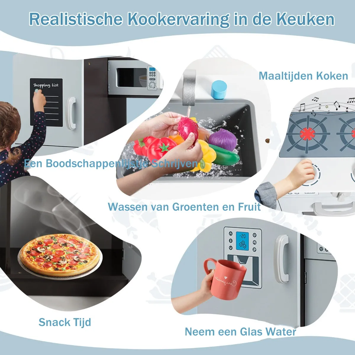 Levensechte speelkeuken: Dit keukenspeelgoed is verdeeld in verschillende secties, zoals fornuis, gootsteen, oven, magnetron, koelkast enzovoort. Met deze rijke rubrieken kunnen kinderen doen alsof ze ingrediënten klaarmaken, koken, bakken, enz., wat uw kinderen urenlang plezier oplevert.