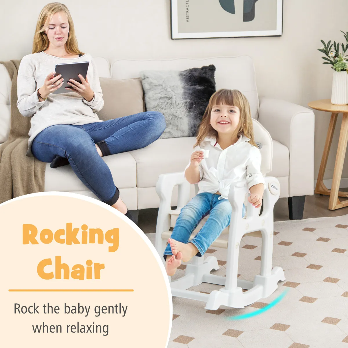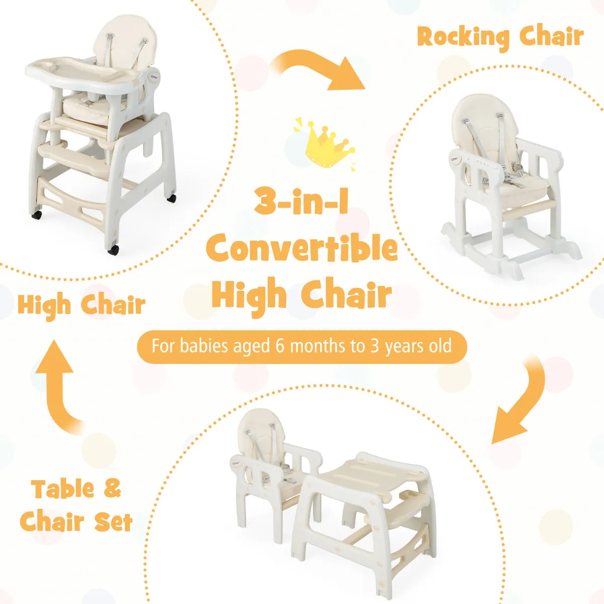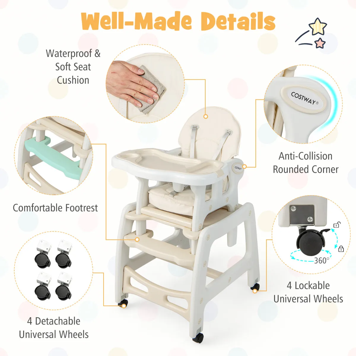 Deze converteerbare kinderstoel zal de groei van uw baby begeleiden. Hij kan worden omgebouwd tot stoel en tafel, en de stoel kan worden omgebouwd tot schommelstoel. Het dienblad en het zitkussen zijn afneembaar naargelang uw behoeften. Bovendien kunnen de rugleuning en het dienblad in 3 standen worden versteld voor een beter zitcomfort. Het dubbele dienblad is geschikt voor verschillende doeleinden. Het bovenste dienblad met beker- en bestekhouders is perfect voor voeding en zelfstandige voeding. Het dienblad is gemaakt van onschadelijk PP-materiaal. Uitgerust met 4 universele wielen is deze converteerbare kinderstoel gemakkelijk te verplaatsen.