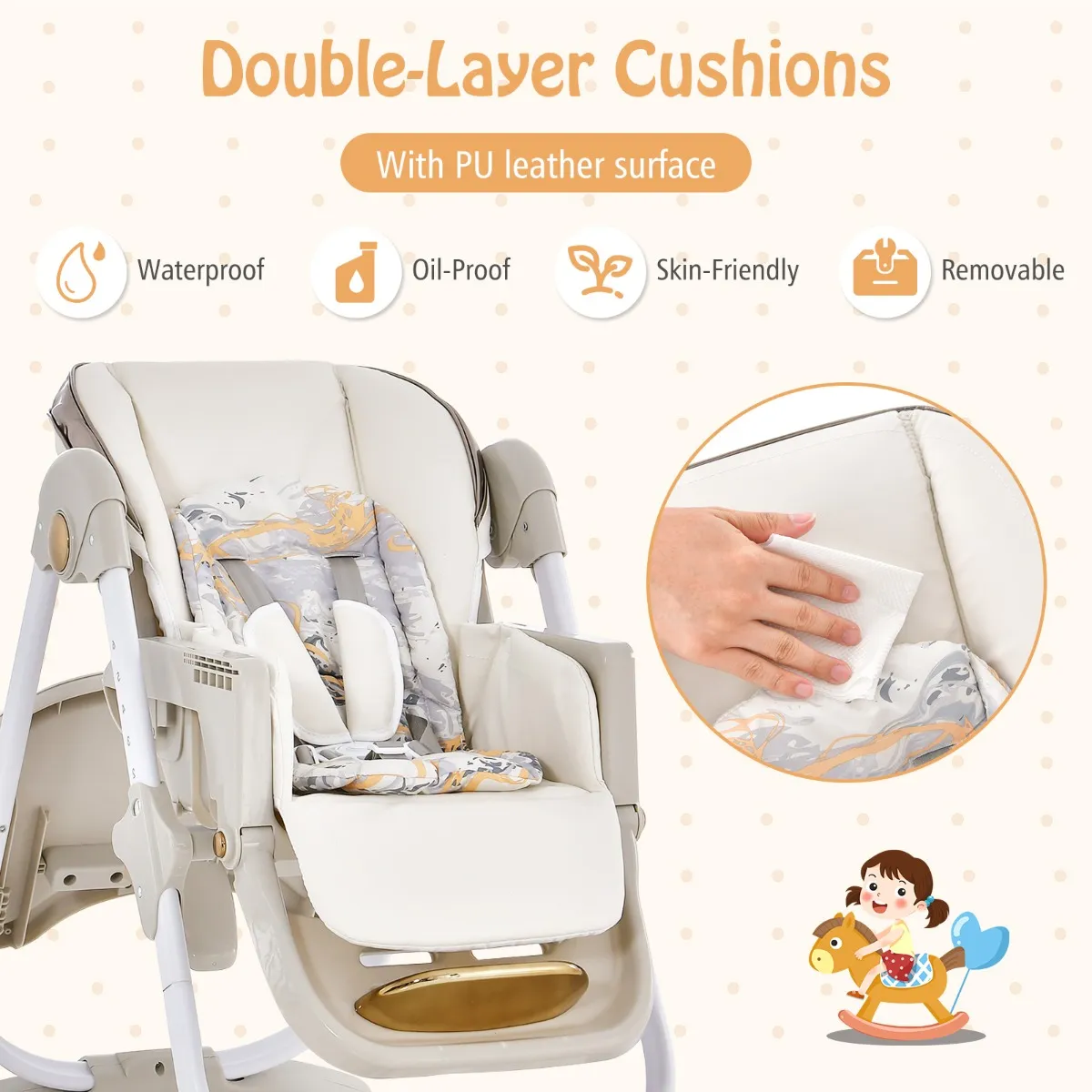 Deze kinderstoel heeft verstelbare functies zoals 6 zithoogtes, een rugleuning met 3 standen, een voetensteun met 3 standen en afneembare dubbele plateaus. Hij is gemaakt van duurzaam PP en robuust metaal en zorgt voor veiligheid en stabiliteit. Schoonmaken is eenvoudig dankzij het verwijderbare, vaatwasmachinebestendige dienblad en de gladde, waterbestendige PU-zitting die eenvoudig kan worden schoongeveegd. Dankzij de 360° draaibare wielen met rem kun je hem moeiteloos van de ene kamer naar de andere verplaatsen. Hij is licht van gewicht en opvouwbaar voor handig opbergen.