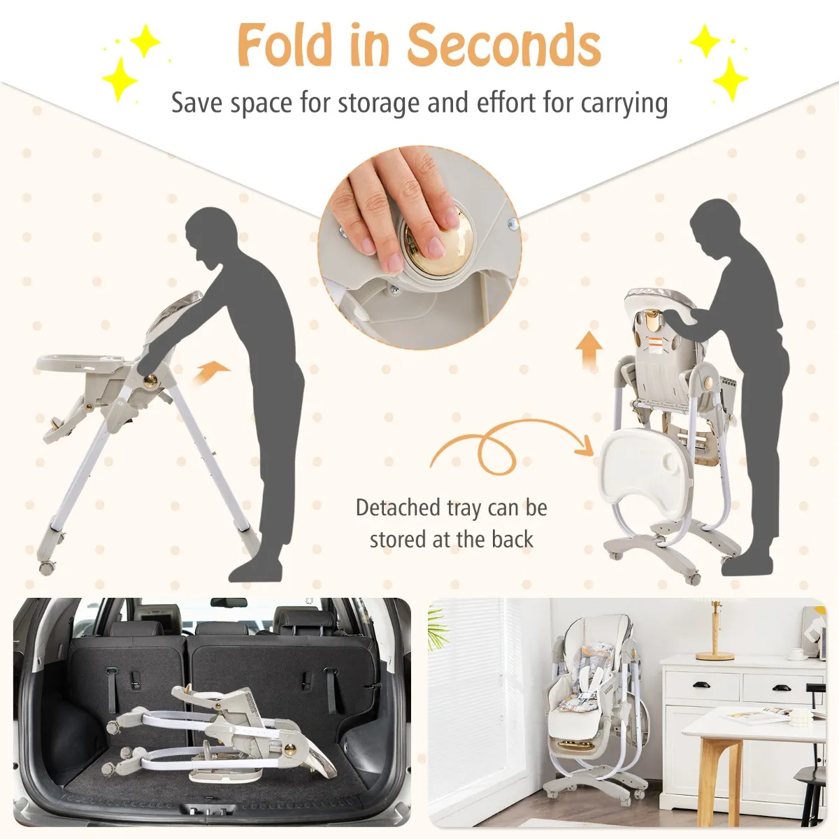Lichtgewicht, opvouwbaar ontwerp: Wanneer de kinderstoel niet in gebruik is, kan hij gemakkelijk met één klik worden opgevouwen, waardoor je opbergruimte en transportkosten bespaart. En het losse dienblad kan achterin worden opgeborgen. Bovendien is de hele kinderstoel verkrijgbaar in wit en goud, wat aantrekkelijk is voor kinderen.