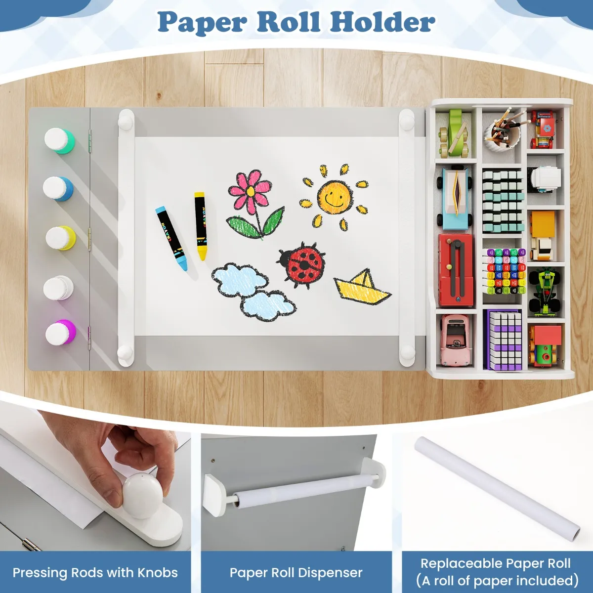 【Praktische papierroldispenser】: De papierroldispenser is direct in de tafel ingebouwd en bevat een verwisselbare papierrol (één papierrol inbegrepen), waardoor kinderen voortdurend creatief bezig kunnen zijn en gemakkelijk papier kunnen pakken wanneer ze inspiratie krijgen.