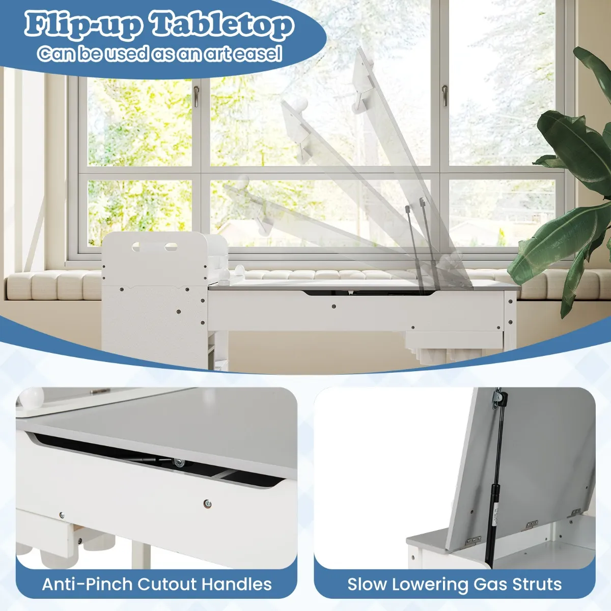 Stimuleer de creativiteit van uw kind met deze veelzijdige kunsttafelset, een perfect activiteitencentrum voor tekenen, knutselen en nog veel meer. Dankzij het opklapbare blad dat kan worden omgebouwd tot een ezel en de diverse opbergvakken kunt u op deze tafel uw kunstbenodigdheden efficiënt ordenen. De ingebouwde papierroldispenser biedt eindeloze creativiteit: er wordt één papierrol meegeleverd die u direct kunt gebruiken. Veiligheid staat voorop bij deze kinderbureau- en stoelset. Zo creëert u een stevige en veilige werkplek.