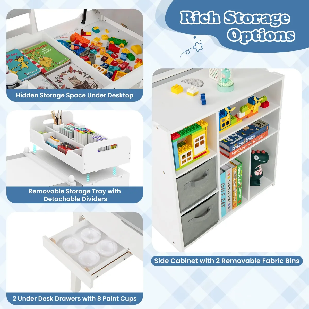 【Veel opbergmogelijkheden】: Deze knutseltafel heeft een verborgen opbergruimte onder het bureau, een verwijderbaar dienblad met verwijderbare verdelers, een zijkast met 2 verwijderbare stoffen bakken en 2 laden onder het bureau met 8 verfpotten, waardoor alle kunstbenodigdheden van je kind effectief georganiseerd worden. Afmetingen tafel: 120 x 60 x 60 cm (L x B x H).