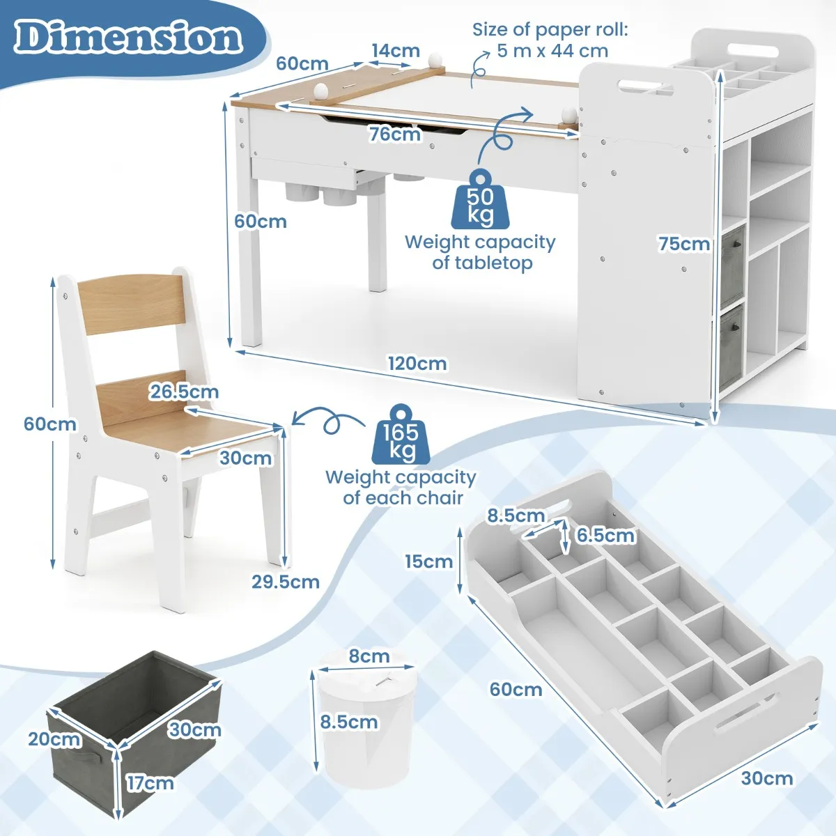【Veel opbergmogelijkheden】: Deze knutseltafel heeft een verborgen opbergruimte onder het bureau, een verwijderbaar dienblad met verwijderbare verdelers, een zijkast met 2 verwijderbare stoffen bakken en 2 laden onder het bureau met 8 verfpotten, waardoor alle kunstbenodigdheden van je kind effectief georganiseerd worden. Afmetingen tafel: 120 x 60 x 60 cm (L x B x H).