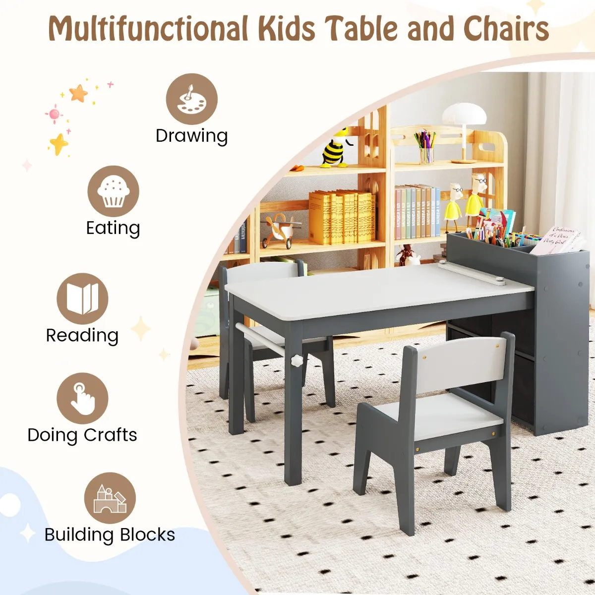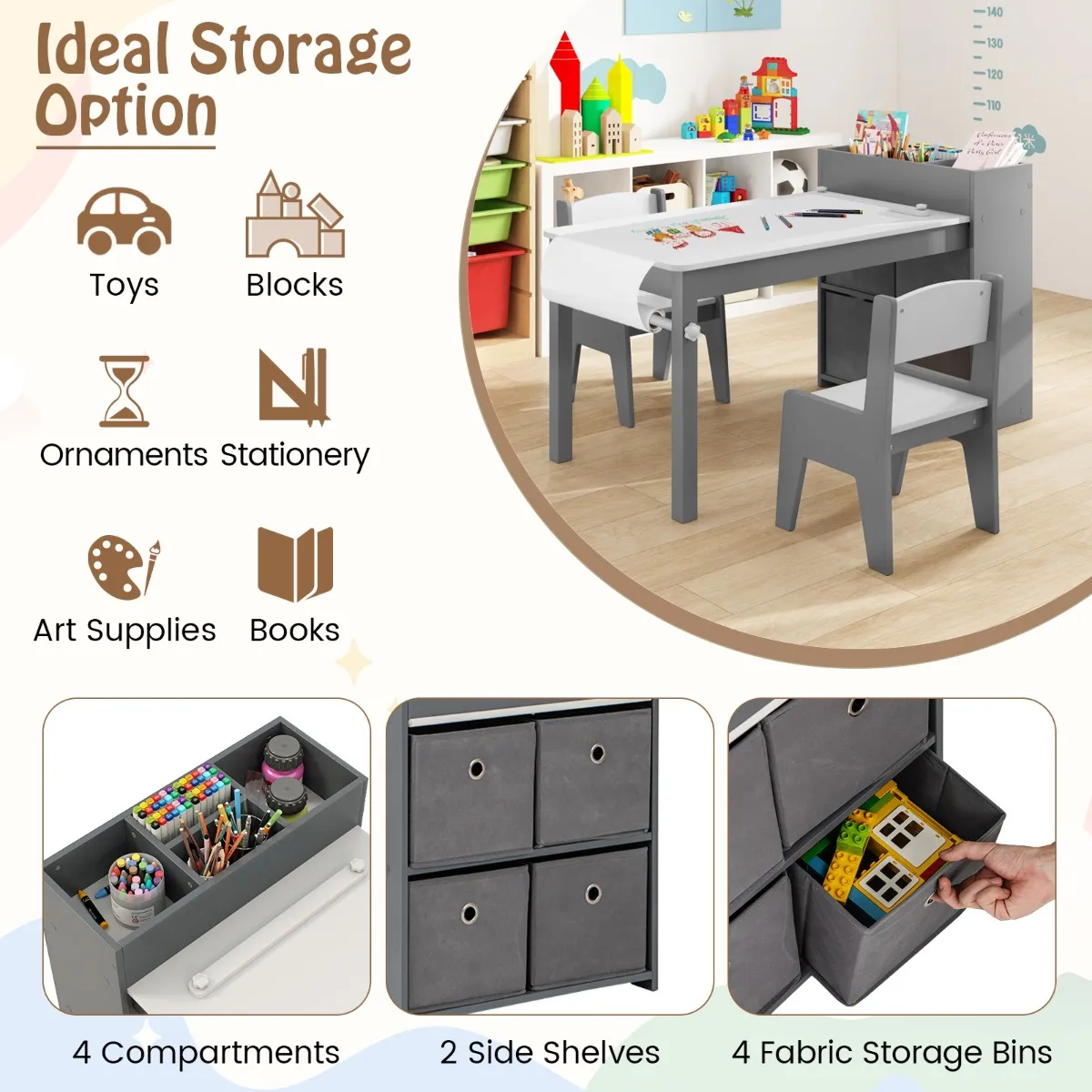 Verras uw kleine kunstenaar met onze kunsttafel en 2 stoelenset. Ideaal om mee te eten, lezen, blokken te bouwen of te tekenen. Inclusief 1 rol papier. Met de drukstang met knoppen kunt u het tekenpapier vastzetten. Na gebruik kan de papierrol in de rolhouder worden vastgezet. De aflopende rugleuningen van de stoelen zorgen voor een comfortabele ondersteuning van de rug. De activiteitentafel is voorzien van 2 zijplanken met 4 uitneembare stoffen bakken en 4 opbergvakken. De set stimuleert de fantasie en creativiteit van kinderen.