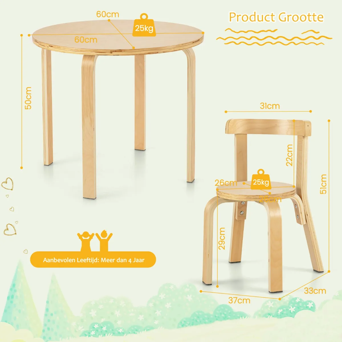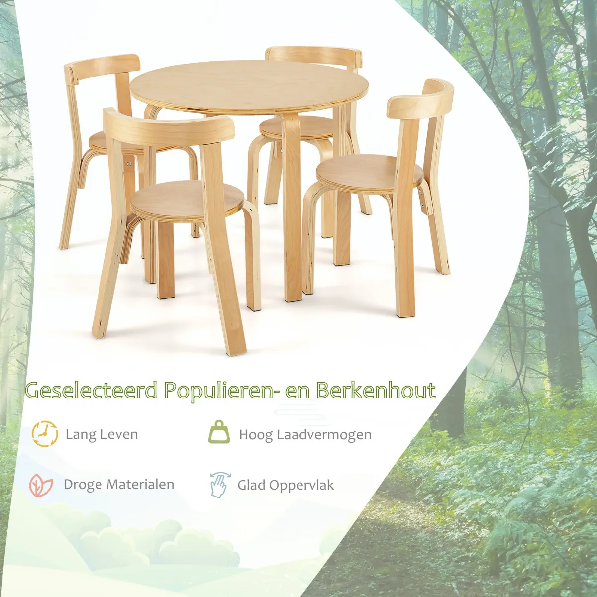 Onze tafel- en stoelset voor kinderen bestaat uit een ronde tafel en 4 stoelen. Dankzij de wetenschappelijke hoogte kunnen uw kinderen comfortabel zitten tijdens het spelen, eten, lezen, tekenen en nog veel meer. Bovendien zijn de stoelen voorzien van gebogen rugleuningen om kinderen te helpen een gezonde zithouding aan te nemen. Gemaakt van hoogwaardige materialen, heeft het massief houten frame een hoog draagvermogen en een lange levensduur. Bovendien zorgen de antislip voetkussentjes voor extra stabiliteit tijdens het zitten. Het waterdichte en gladde oppervlak is gemakkelijk te reinigen. Bovendien kunnen de stoelen volledig onder de tafel worden geschoven of bovenop de tafel worden gestapeld voor opslag. Deze kindertafel en stoelenset is niet alleen geschikt voor thuis, maar ook ideaal voor kleuterschool, kinderdagverblijf en klaslokaal. Het is het perfecte cadeau voor uw kinderen vanaf 4 jaar.