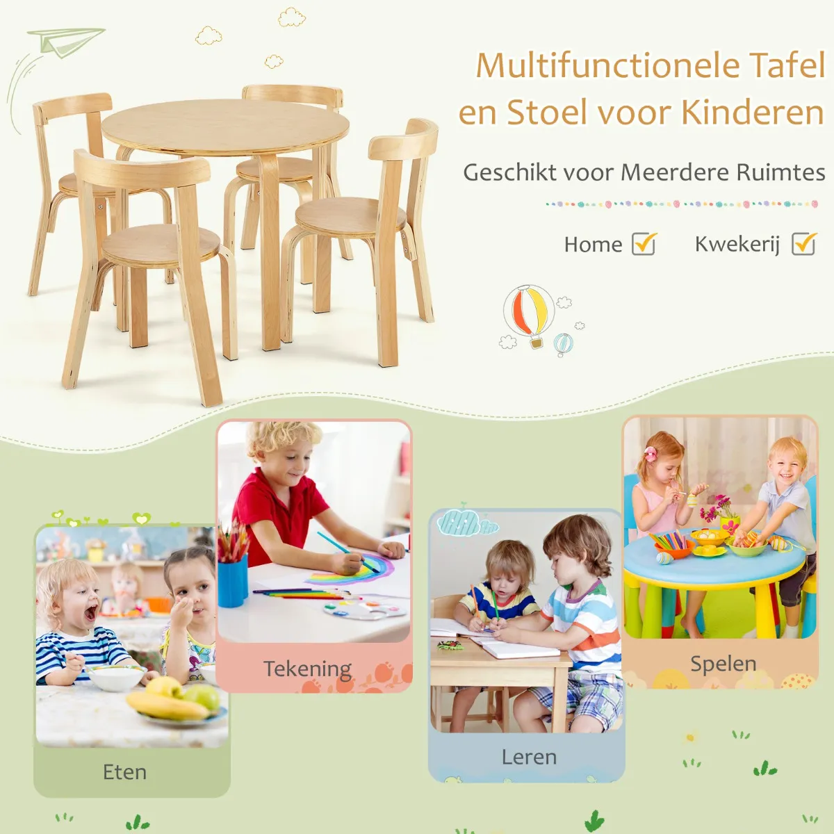 5-delige tafel- en stoelset voor kinderen, bestaande uit een ronde tafel en 4 stoelen