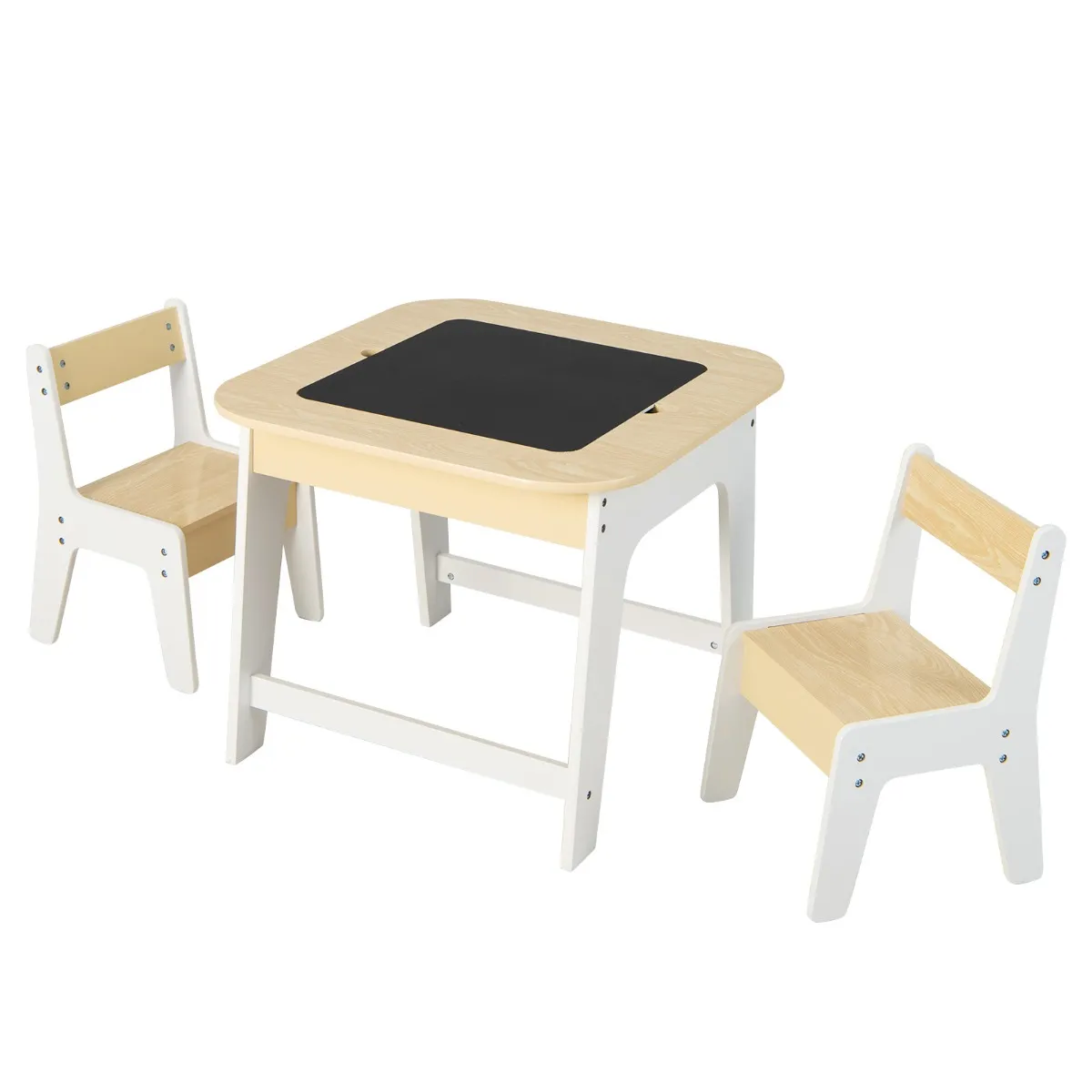 Het dubbelzijdige tafelblad beschikt over een whiteboard en een bord, zodat kinderen met hun vrienden kunnen tekenen. Bovendien helpt de verborgen opbergruimte de kinderen om een goede gewoonte voor het sorteren te ontwikkelen. Als je peuters moe zijn, kunnen ze op onze ergonomische stoelen rusten. Na gebruik kun je deze stoelen onder de tafel schuiven. Het gladde, gelakte oppervlak kan gemakkelijk worden gereinigd en bespaart zo tijd en energie.