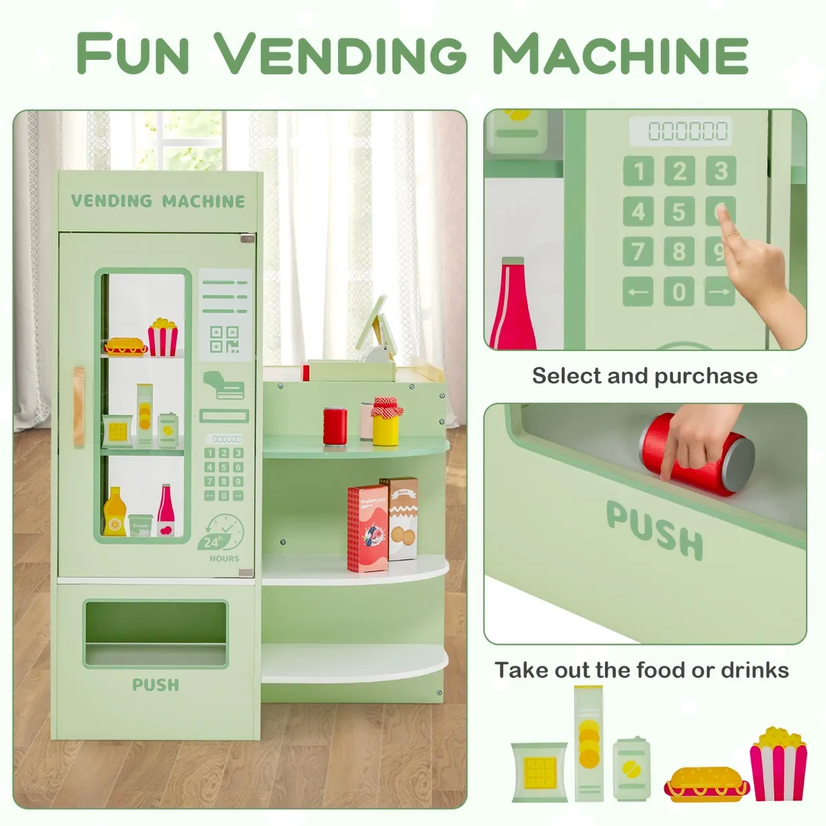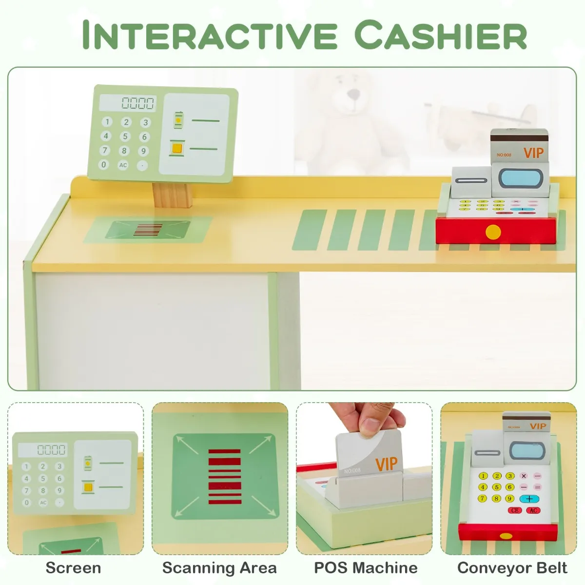 De zijdelingse verkoopautomaat maakt het mogelijk om kinderen aan te geven snacks en dranken te plaatsen, verschillende artikelen te kopen of het artikel eruit te nemen. Peuters mogen ook prijzen op het bord schrijven. Of je kunt ook uitchecken of winkelen simuleren met een houten POS-machine en een creditcard om meer over geld te leren. Bovendien zijn er 3 open planken en 2 tentoonstellingsrekken om verschillende dingen op te bergen en kinderen te helpen een goede gewoonte van de orde te ontwikkelen.