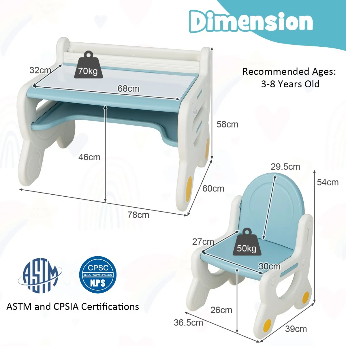 【Overschilderbaar en afveegbaar tafelblad】De kindertekentafel en stoelenset is uitgerust met een afveegbaar graffiti-tafelblad. Dit betekent dat kleine kinderen kunnen tekenen met de meegeleverde aquarelpotloden en het tafelblad kunnen schoonmaken met de meegeleverde gum. De tafel kan een gewicht van 70 kg dragen, terwijl de stoel 50 kg kan dragen.
