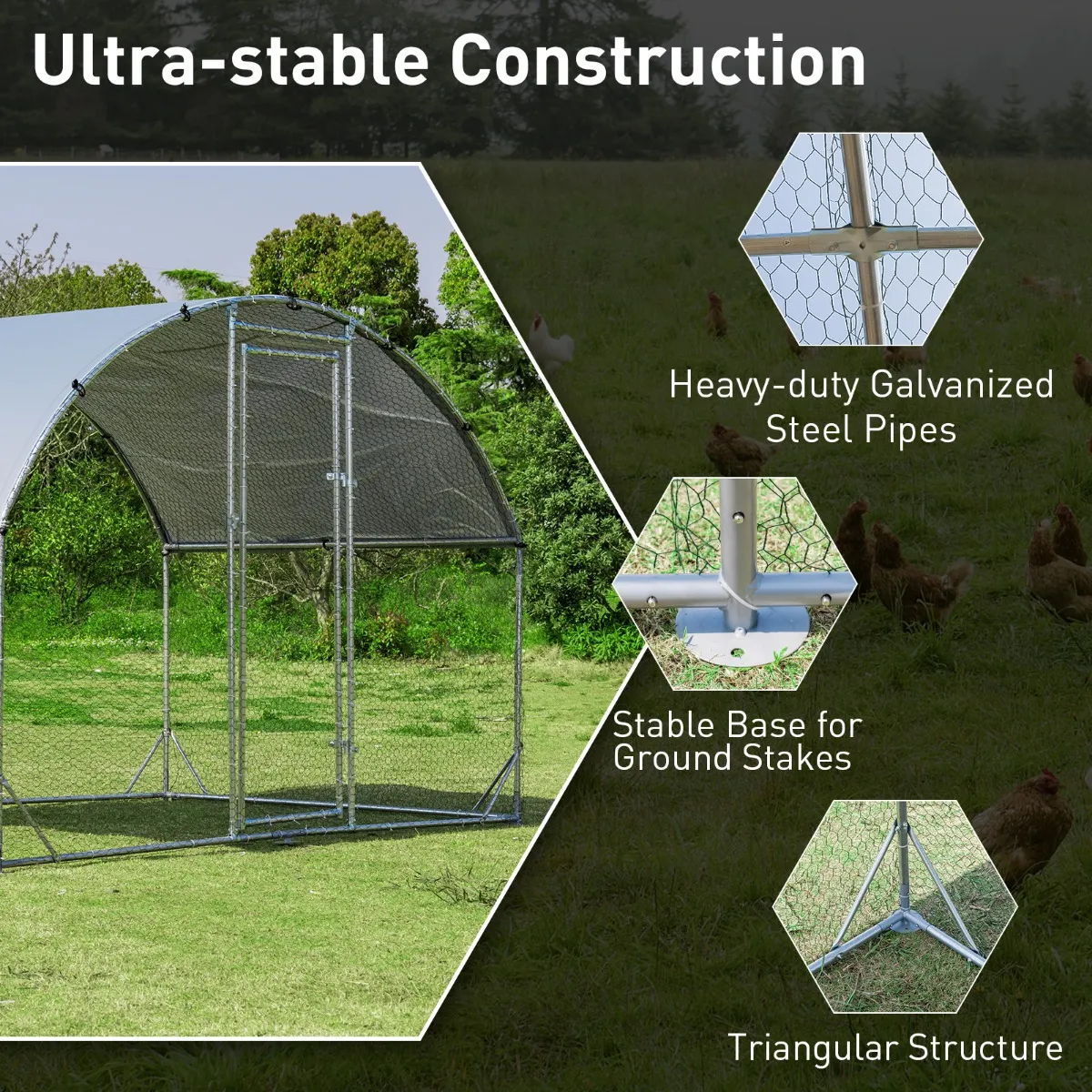 Uitstekende stabiliteit en duurzaamheid: Ons kippenhok is gemaakt van stevig metalen frame met gegalvaniseerde behandeling en is extreem stevig, roestbestendig en duurzaam, geschikt voor langdurig gebruik buitenshuis. Bovendien verhoogt de stabiele driehoekige structuur in combinatie met grondpinnen de stabiliteit aanzienlijk.