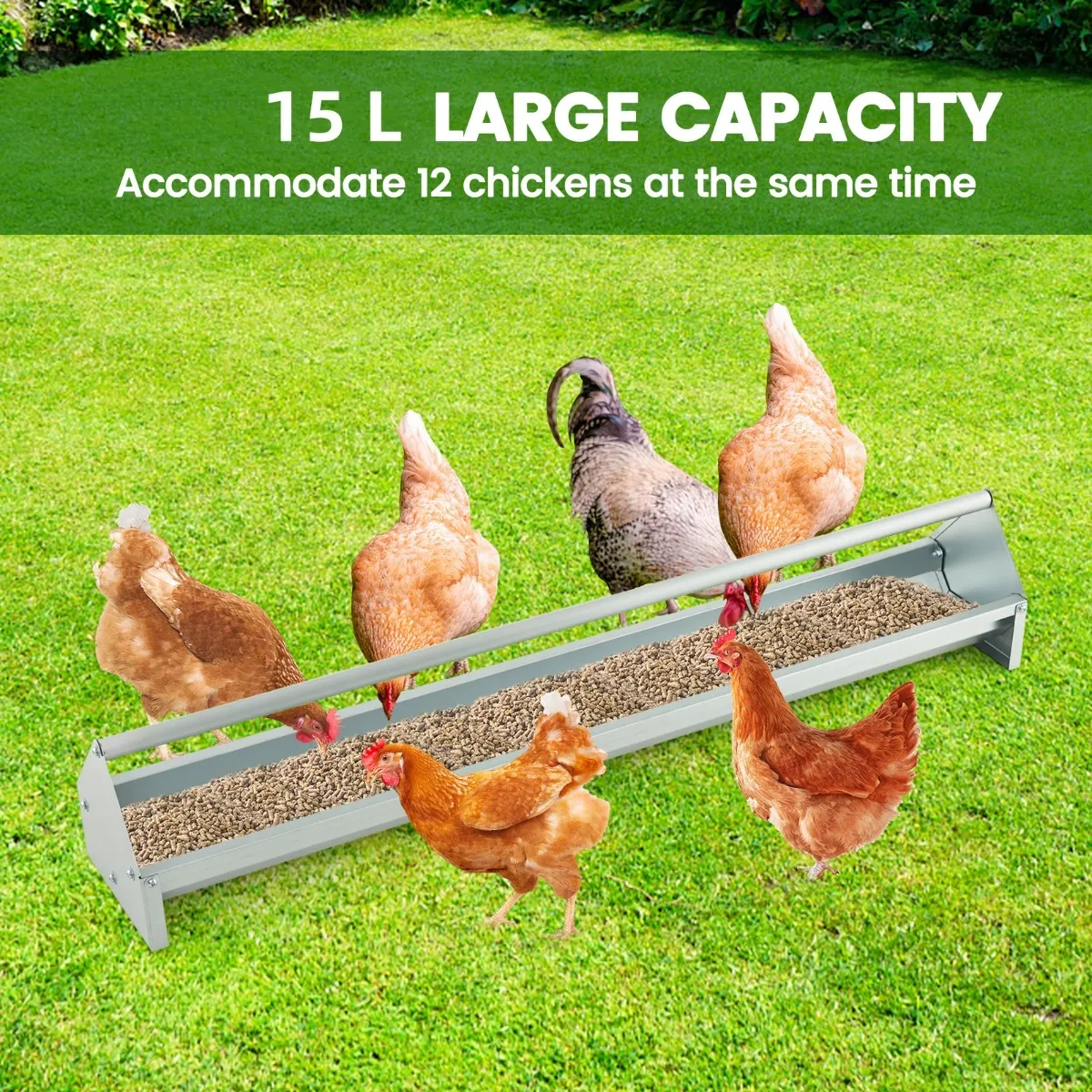 Met onze metalen kippenvoerbak met grote capaciteit kunt u van twee kanten voeren, waardoor er 12 kippen tegelijk kunnen eten. Dankzij het omgeslagen randontwerp zijn de kippen minder gevoelig voor blessures. Bovendien voorkomt de roterende paal dat vogels erop kunnen trappen. Uitgerust met twee afvoergaten, kan overtollig water weglopen zodat uw kippen toegang hebben tot vers en droogvoer. De twee stoppen zorgen ervoor dat er niets wordt verspild en dat er geen rommel ontstaat als uw kippen eten. Onze gegalvaniseerde metalen feeder is waterdicht en barstbestendig, zodat hij de tand des tijds zal doorstaan. Vergeleken met plastic materialen is metaal zwaarder en zal het minder snel breken. En de trapeziumvormige structuur zorgt voor een ongeëvenaarde stabiliteit. De lange paal fungeert tevens als praktisch handvat en voorkomt dat vogels erop trappen. Naast kippen is deze graandoseerder ook te gebruiken voor duiven, eenden en ander pluimvee.