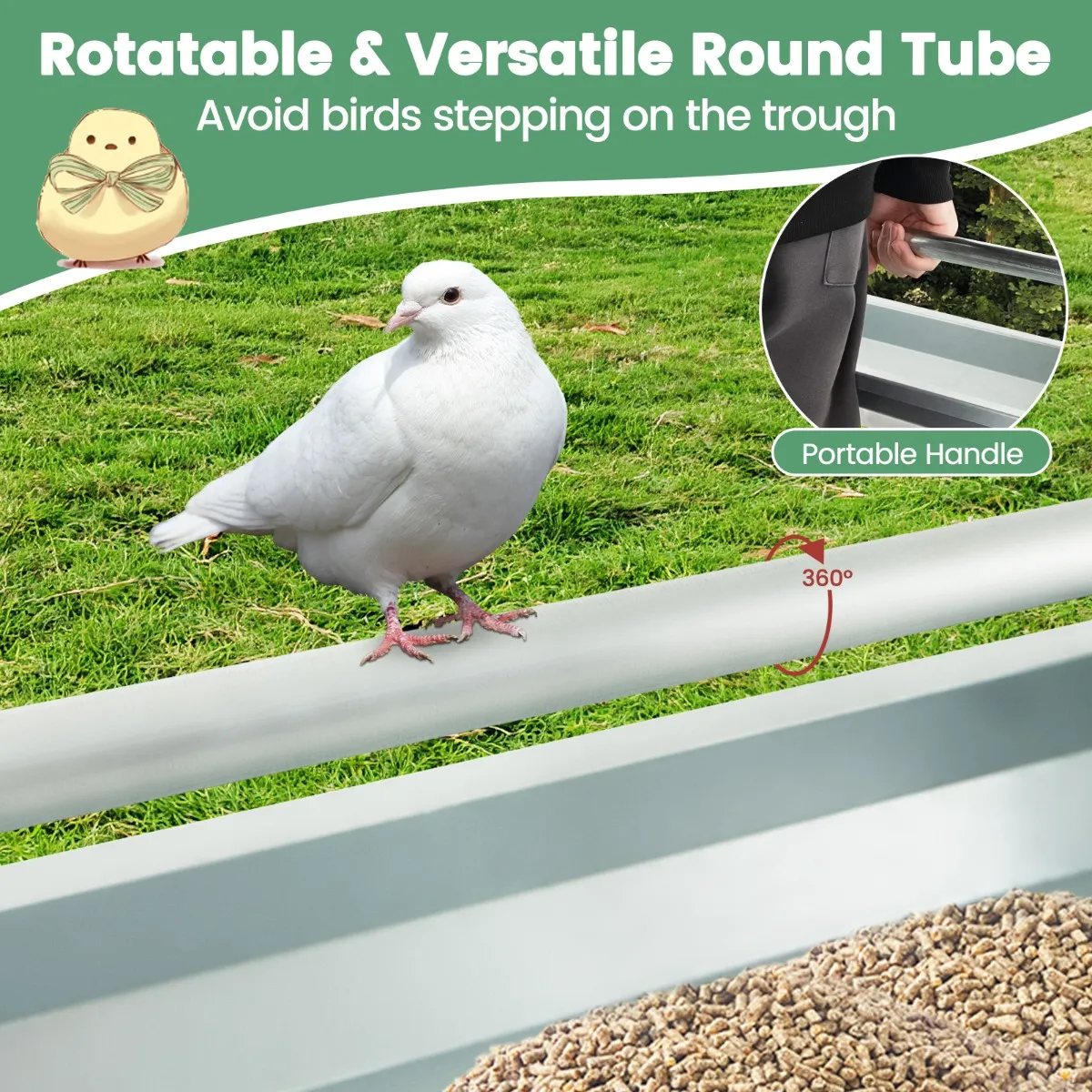 Draagbaarheid en veelzijdige toepassing:Â De lange paal kan dienen als draagbaar handvat, zodat u de trog naar verschillende plaatsen kunt dragen en verplaatsen. Naast kippen kan de robuuste kippenvoerbak ook gebruikt worden voor het voeren van duiven, eenden en ander pluimvee.