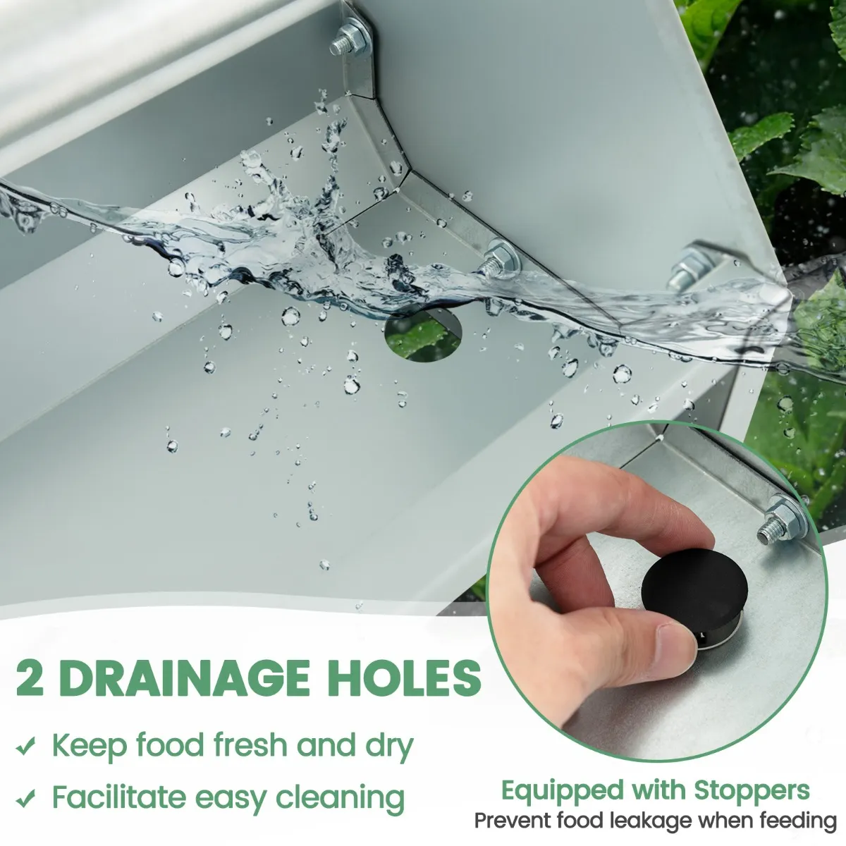 Houdt het voergedeelte droog:Â De voerbak voor pluimvee is uitgerust met 2 afvoergaten waardoor overtollig water kan weglopen, zodat uw kippen altijd toegang hebben tot vers en droog voer. Met 2 stoppen is er geen verspilling en geen rommel terwijl uw kippen eten.