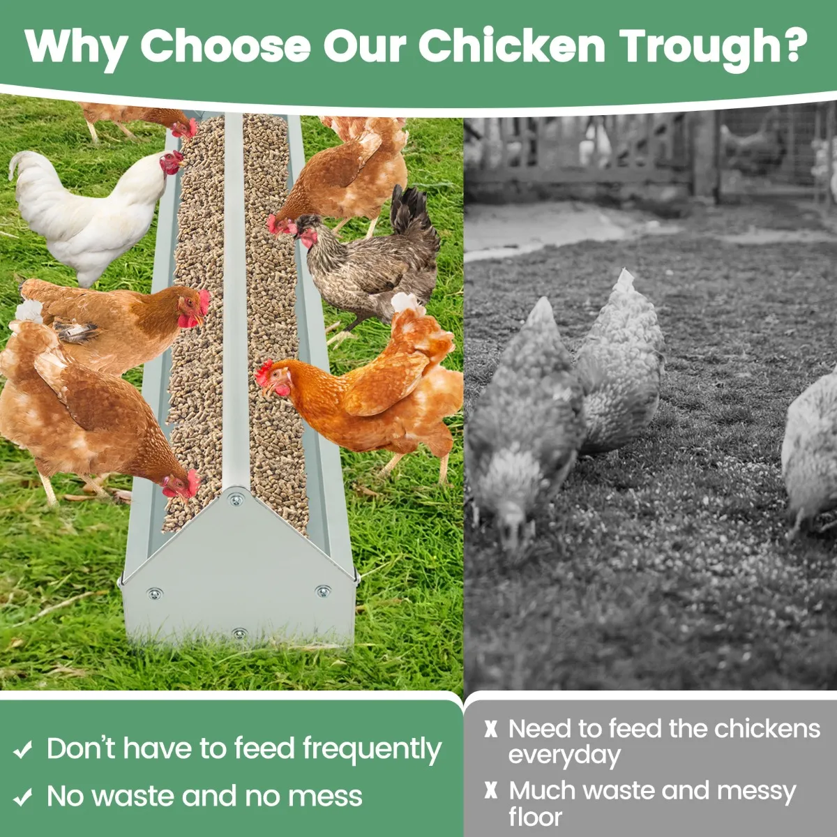 Weerbestendig materiaal: De gegalvaniseerde metalen kippenvoederbak is gemaakt van duurzaam gegalvaniseerd metaal en is roestbestendig, gemakkelijk schoon te maken en bestand tegen vervorming. Bovendien is het bestand tegen de barre weersomstandigheden en zorgt het voor een lange levensduur van uw kippen.
