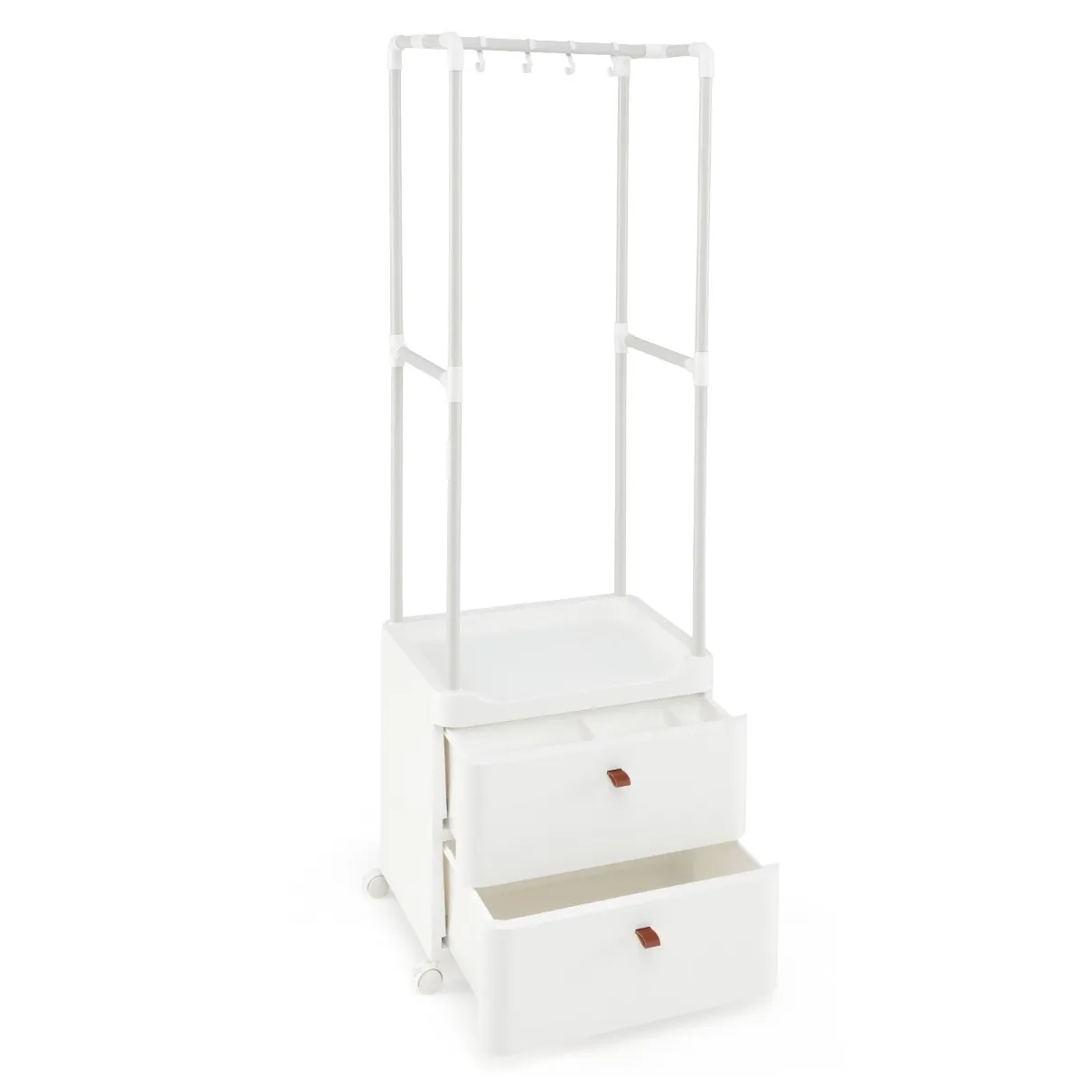 Organiseer je garderobe in stijl met dit multifunctionele kledingrek. Met een ophangstang met 4 afneembare haken, een centrale plank en 2 lades met 1 tussenschot, biedt het gemakkelijk toegang tot je kleding en accessoires. Het stevige metalen frame met versterkte dwarsbalken houdt je spullen stabiel en veilig. Verplaats en zet het moeiteloos vast met de 4 universele wielen, waarvan er 2 vergrendelbaar zijn voor extra stabiliteit. Verbeter je ruimte met dit veelzijdige rek dat een opbergrek, stang en laden combineert.