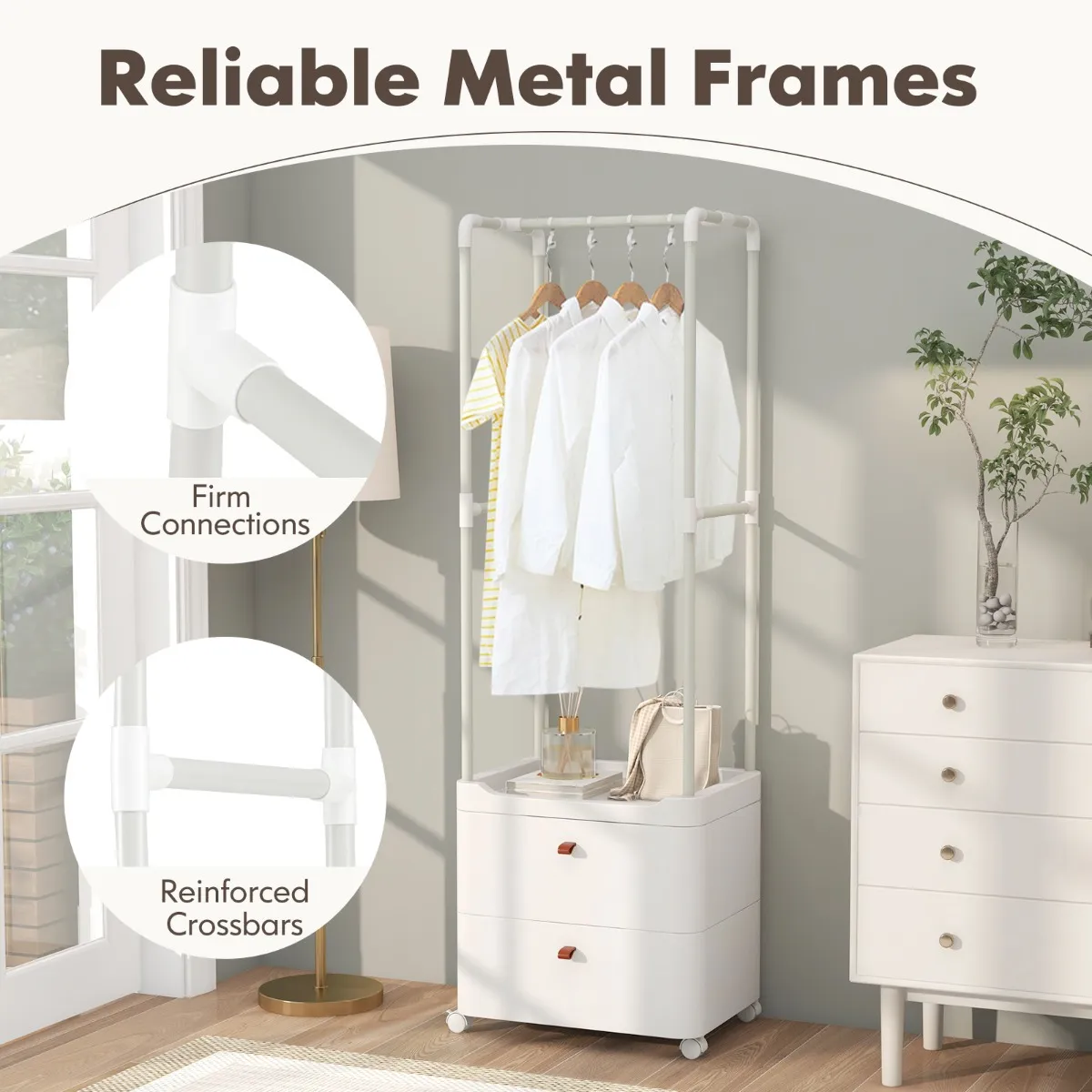 【Stevig, veilig frame】: Met een betrouwbaar metalen frame is dit kledingrek stabiel en veilig. Bovendien zorgen de extra verstevigde dwarsbalken en stevige verbinding er ook voor dat je spullen in veilige handen zijn bij dit betrouwbare kledingrek.