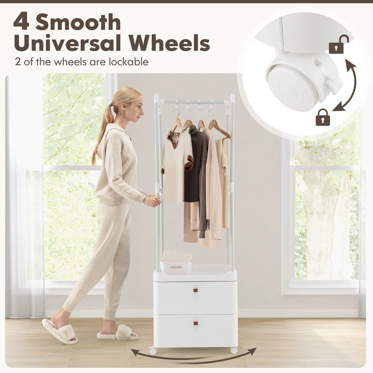 【Moeiteloze mobiliteit en bevestiging】: Ontworpen met 4 soepele universele wielen, kun je de positie gemakkelijk aanpassen en genieten van het gemak van eenvoudige mobiliteit bij het reorganiseren van je ruimte. 2 van de wielen zijn vergrendelbaar, zodat je dit grote kledingrek gemakkelijk op zijn plaats kunt bevestigen als dat nodig is.