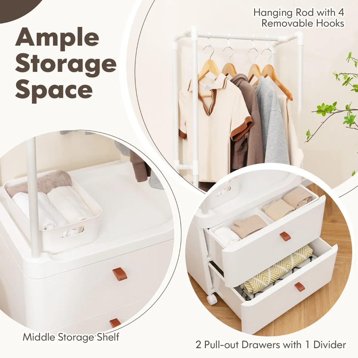 【Ruime opbergruimte】: Dit kledingrek heeft een hangroede, een centrale opbergplank en 2 lades, voor gemakkelijke toegang en opslag van je kleding. 4 afneembare haken en een verdeler geven je de flexibiliteit om kleine spullen zoals tassen of sokken op te bergen.