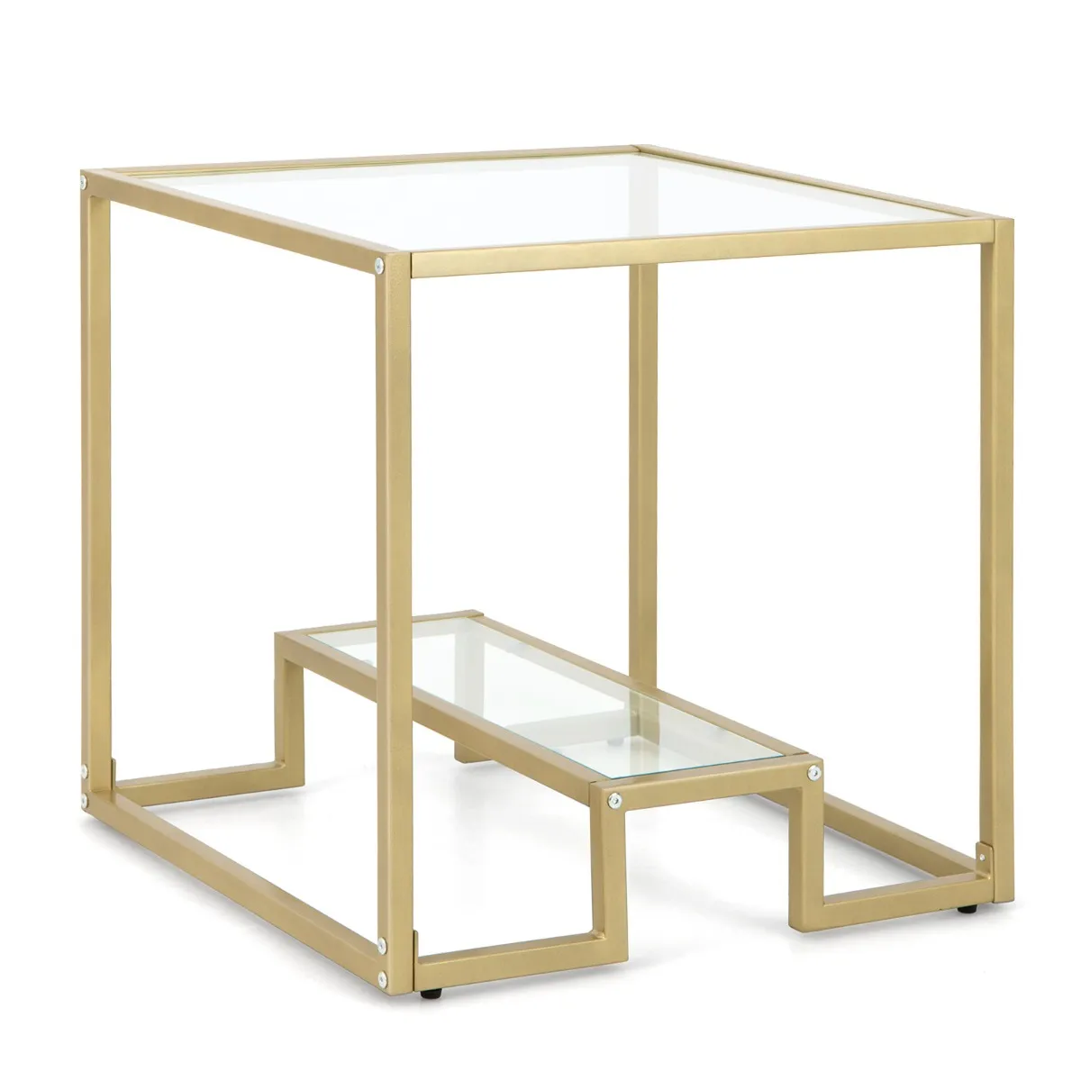 Het beschikt over een vierkant tafelblad en een rechthoekig rek, beide gemaakt van hoogglanzend gehard glas voor een lange levensduur. En het gouden metalen frame past goed bij het glas en zorgt voor een elegante, luxe en moderne uitstraling. Het gouden frame is daarentegen vrij stabiel, omdat de robuuste metalen buizen een aanzienlijk draagvermogen bieden. En de 4 verstelbare kussens helpen om de tafel uit te lijnen en zorgen zo voor extra stabiliteit. Wat het gebruik betreft is de stijlvolle bijzettafel niet alleen een decoratief en veelzijdig stuk in de woonkamer, maar ook een functionele en aantrekkelijke aanvulling voor de slaapkamer, werkkamer en entree.