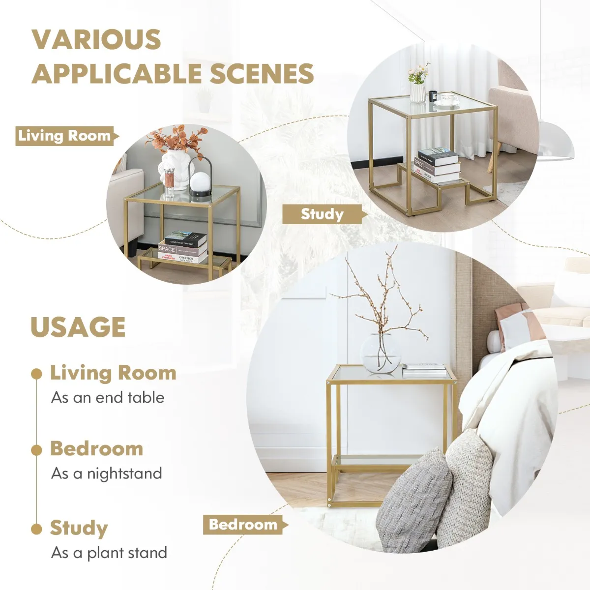 Het beschikt over een vierkant tafelblad en een rechthoekig rek, beide gemaakt van hoogglanzend gehard glas voor een lange levensduur. En het gouden metalen frame past goed bij het glas en zorgt voor een elegante, luxe en moderne uitstraling. Het gouden frame is daarentegen vrij stabiel, omdat de robuuste metalen buizen een aanzienlijk draagvermogen bieden. En de 4 verstelbare kussens helpen om de tafel uit te lijnen en zorgen zo voor extra stabiliteit. Wat het gebruik betreft is de stijlvolle bijzettafel niet alleen een decoratief en veelzijdig stuk in de woonkamer, maar ook een functionele en aantrekkelijke aanvulling voor de slaapkamer, werkkamer en entree.