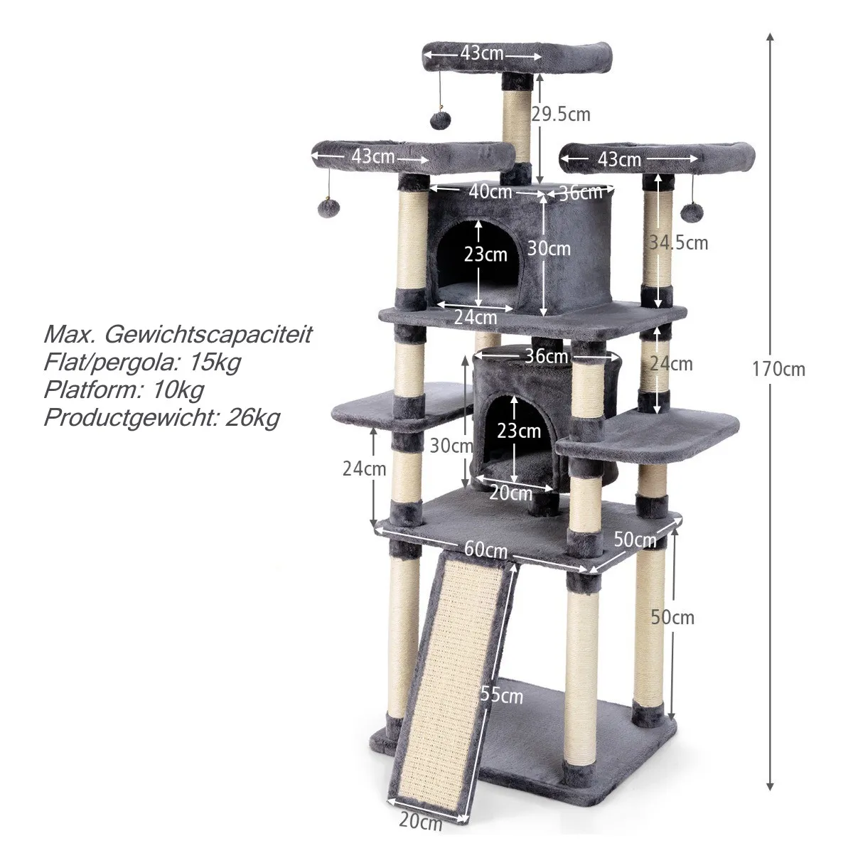 Gemaakt van duurzame planken en bedekt met zacht bont stof, deze kat boom biedt uw schatjes met een geweldige entertainment center. De gevoerde bovenste zitstokken met bungelende ballen laten schattige katten al plagend toekijken vanaf 170 cm hoogte. Grote zitplaatsen met zachte kussens bieden kittens een comfortabele slaapplaats na het ontladen van hun energie. Ruime platforms bieden uw kleintje de mogelijkheid om in de luie namiddag te genieten van de zonnestralen. Deze meerlaagse kattenboom voldoet aan alle behoeften van uw kat om te ontspannen, te slapen en te spelen. Bovendien heeft dit huisdier meubeltje een moderne uitstraling passend bij diverse inrichtingsstijlen.