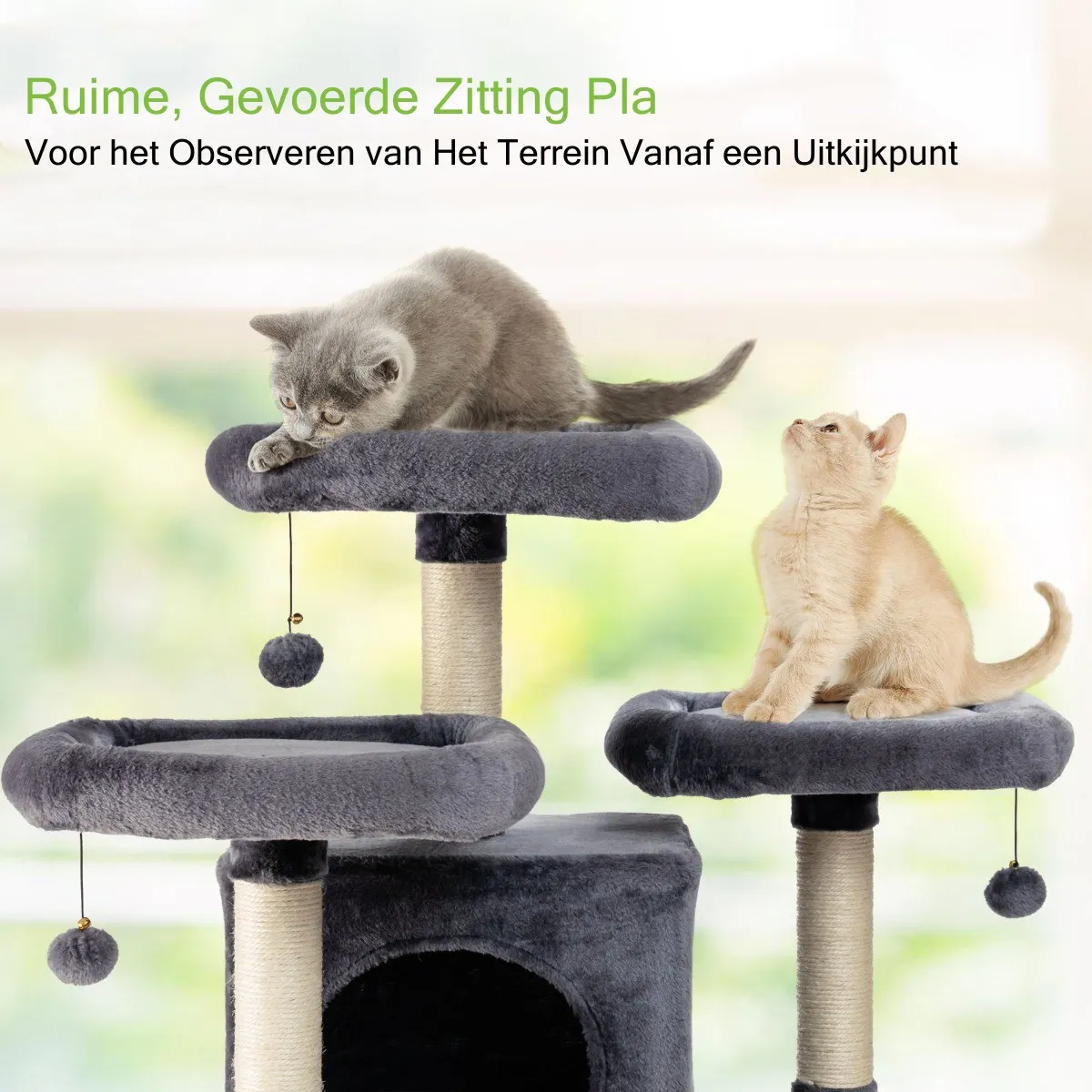 3 gecapitonneerde zitstokken zorgen ervoor dat katten het terrein kunnen observeren vanaf een hoogte van 170 cm