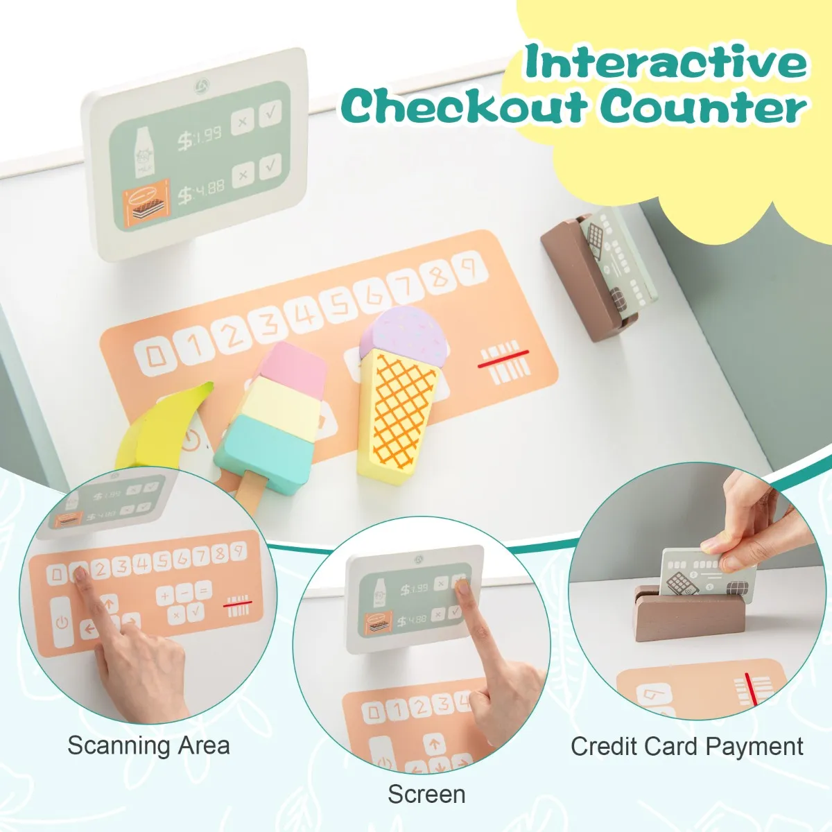【Realistische kassa-ervaring】: Ontworpen om een echte supermarktervaring na te bootsen, bevat de houten standaard een kassa met scangebied, scherm en creditcardbetalingsoptie. Dit is een ideale leermogelijkheid voor kleine caissières om vroeg wiskundig en financieel bewustzijn te ontwikkelen.
