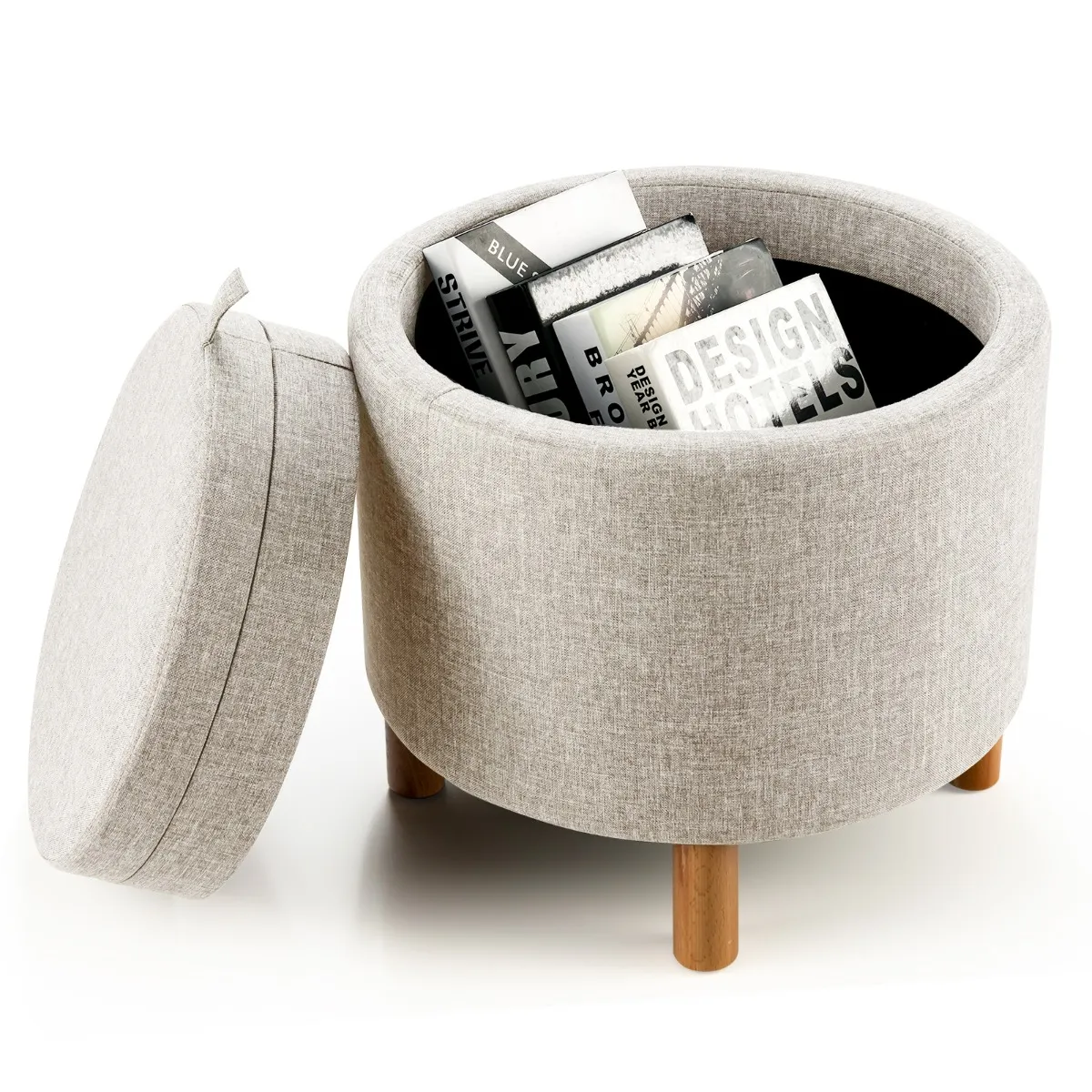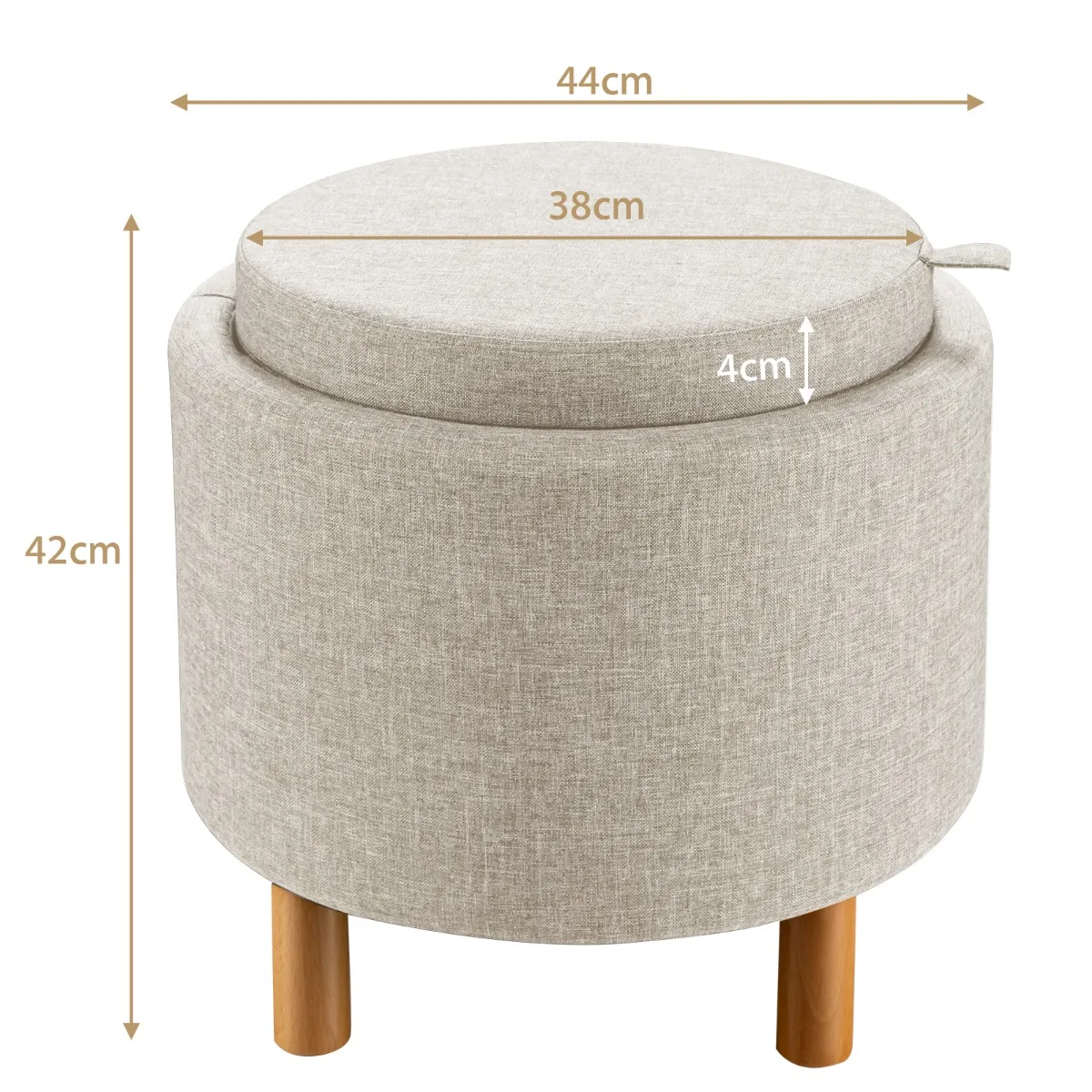 Onze ronde opbergpoef beschikt over een afneembaar deksel met twee zijden, die de gevoerde zitting met een houten dienblad combineert. De voetenbank kan daarom als voetenbank, extra kruk of salontafel worden gebruikt. Bovendien biedt het verborgen vak aan de binnenkant van de voetenbank veel opbergruimte voor kleine spullen, waardoor je je kamer netjes en schoon kunt houden. De kruk is uitgerust met zachte bekleding en bekleed met ademende stof om maximaal comfort te garanderen. De poten zijn gemaakt van massief grenenhout en voorzien van vier antislip voetkussens om een hoog draagvermogen en extra stabiliteit te garanderen.