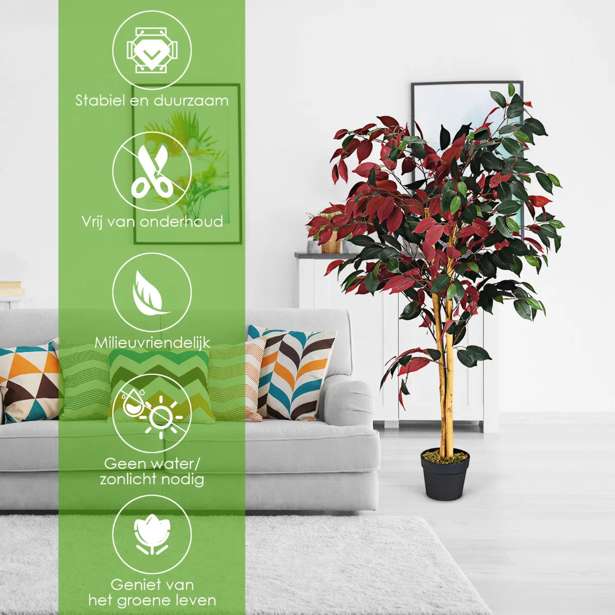 Onze kunstmatige ficus heeft een weelderige, levensechte uitstraling waardoor elke woonruimte er natuurlijker uitziet. Niet alleen de bladeren hebben een duidelijke structuur, ook de takken zijn voorzien van stevige draden die naar wens gepositioneerd kunnen worden. De hardhouten stam en cementbasis zorgen voor een sterke stabiliteit om hem stevig op de grond te houden. De mosdecoratie op de bloempot, in combinatie met de realistische stam- en boomvorm, geven je altijd een gevoel van natuurlijkheid. Deze ficus staat prachtig in kamerhoge ramen, deuropeningen en kantoren.