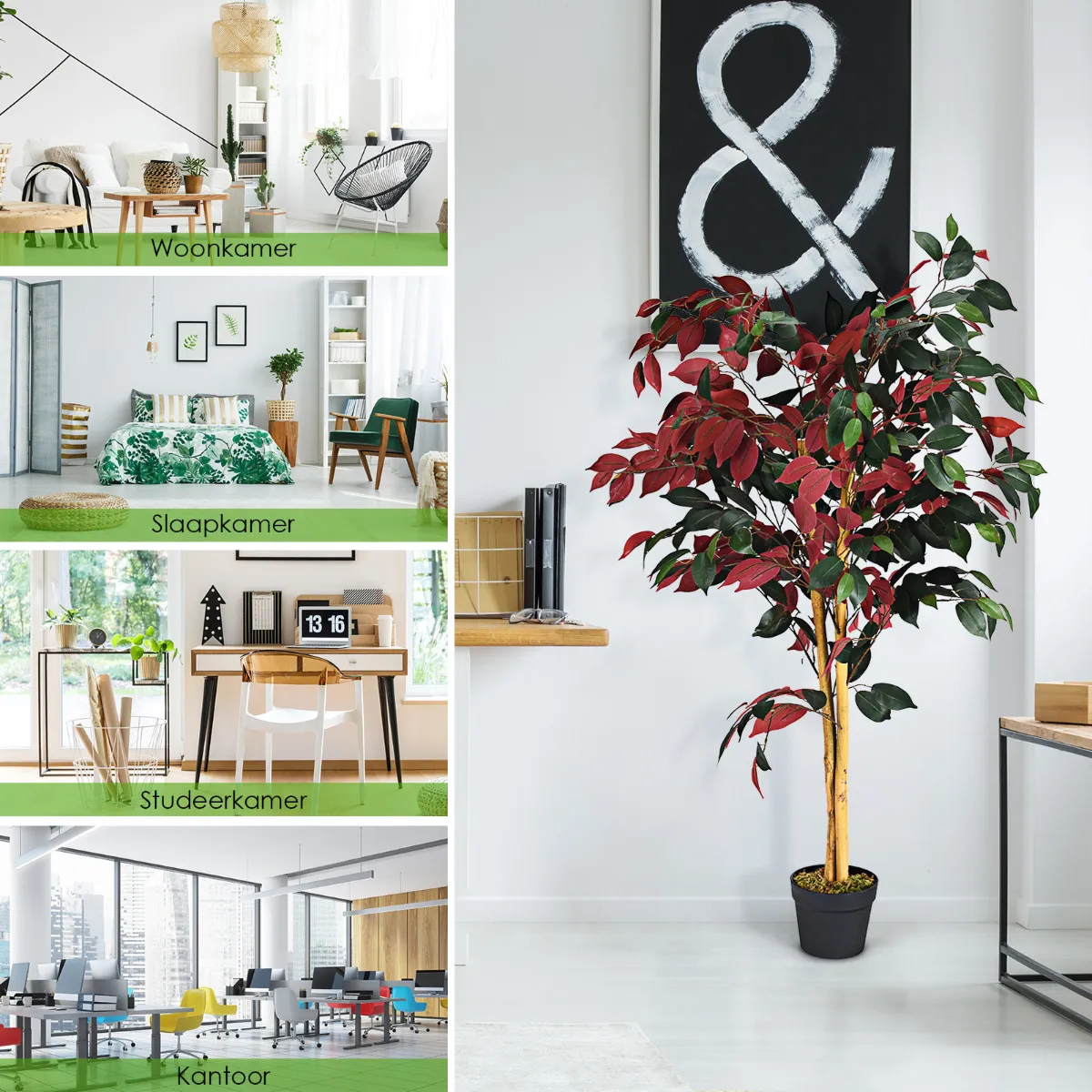 Realistisch groen ontwerp: Deze boom is zorgvuldig gemaakt om het uiterlijk van een echte ficus na te bootsen en is de perfecte keuze om een vleugje groen toe te voegen aan elke kamer in uw huis. De takken van de plant zijn voorzien van stevig draad dat naar wens kan worden gepositioneerd en de stam geeft het een weelderige, levensechte uitstraling.