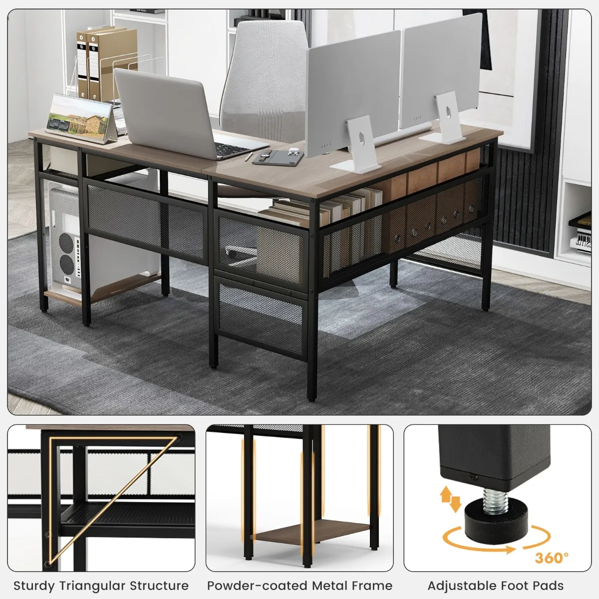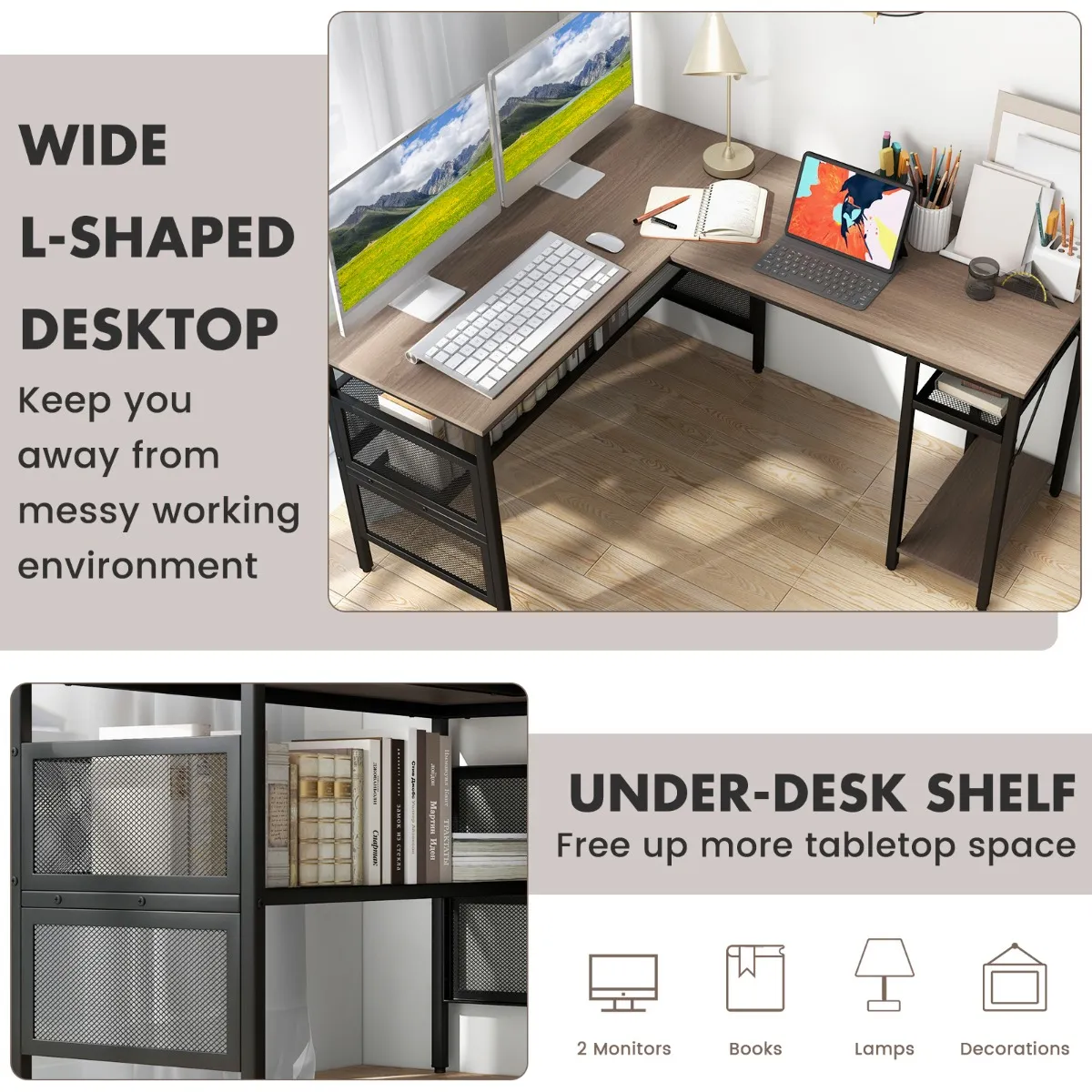 【Gevarieerde opbergruimte】: Het brede L-vormige blad biedt voldoende ruimte voor 2 beeldschermen, boeken en andere kantoorbenodigdheden. Een extra roosterplank maakt ook meer tafelruimte vrij.