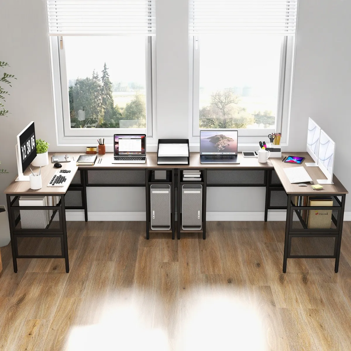 【Grote & Gevarieerde opbergruimte】: Het brede L-vormige bureau biedt niet alleen royale ruimte voor 2 monitoren, boeken en andere kantoorbenodigdheden, maar ook veel werkruimte voor activiteiten in het thuiskantoor. Een extra opbergplank van gaas maakt ook meer ruimte vrij op het bureaublad.